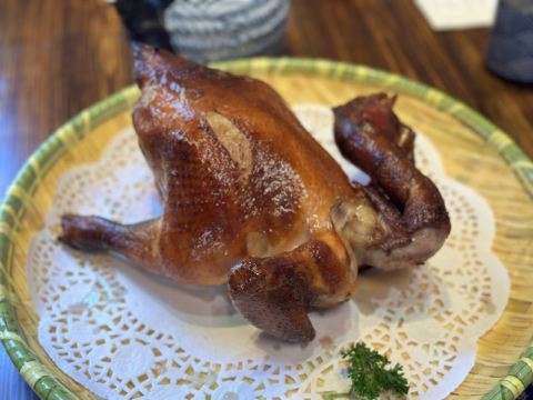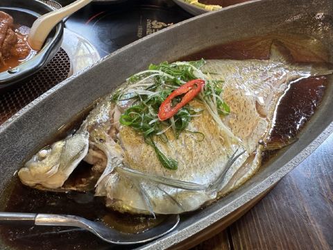 放假了带家人去泡温泉,来到了熹乐谷温泉度假区,这家餐厅是在熹村里面的,二楼两家餐厅的菜品基本上是一样的,过年时候的菜单完全一样,几口舟是楼梯一到二楼左手边的这一家。点了主打的{烧鸡},本来还有烧排骨,但是一份太大了,我们三个人根本吃不完所以放弃。烧鸡要求原只上,为了就是不想斩开以后肉汁完全流掉,当鸡腿一扯开热乎乎地流油那会是最美味的,但是烧鸡有些部位烤糊了,一股烧焦味。 {清蒸边鱼},这条鱼真是太棒了,本来就是因为新年,年年有余好意头才点的,不然鱼刺太多不好吃,幸好点上了,鱼个头挺大的,非常新鲜而且没有泥巴味,很鲜甜,蒸的功夫也到家,火候控制得刚好。