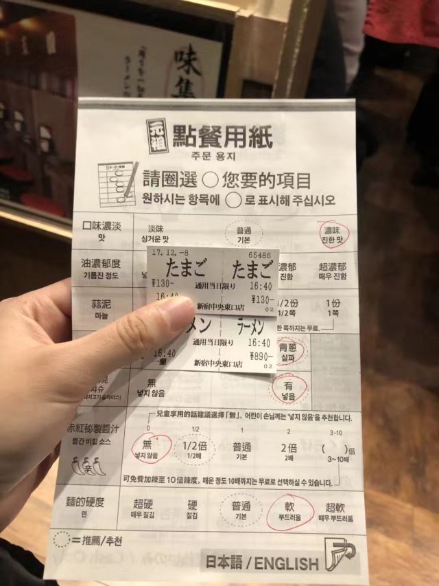 ICHIRAN Shinjuku Station Central East Exit人生中最爱吃的拉面,后悔只吃了一次,以至于回国后每次想到就流口水。汤头那个好喝,不只是浓郁那么简单,绝对是秘方的味道。溏心蛋一定要点,在日本必不可少的配餐,就是好吃! 其实让我印象深刻的不仅仅是一兰的拉面,还有它吃面的环境。店里两个房间都不大,中间夹着一个过道,过道其实就是厨房,饭桌面对厨房,有帘子遮挡,一个人一个位置,两侧有木板遮挡,一个人用餐也很私密。排队时,服务员会提前给菜单,用铅笔在想要的东西上标记,等到坐到餐桌后,放到正前方的帘子前,厨房里的“厨师”会根据标记的菜单上菜,而且上菜很迅速,很麻利。不够也可以再加餐,有多余的菜单,也有服务铃。 真的能感觉出来,因着地方不同,那里的环境和人为都会不同。东京确实是寸土寸金,去了很多饭店,里面都不是特别的大,即使面积大,桌子也会比国内的小很多。我们的四人座相当于他们的六人座,连衣服都有衣架可以挂墙上,确实拥挤的感觉!