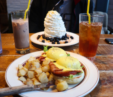 草莓热香饼,草莓、奶油和澳洲坚果薄烤饼(ストロベリー、ホイップクリームとマカダミアナッツのパンケーキ),香蕉、奶油和澳洲坚果薄烤饼(バナナ、ホイップクリームとマカダミアナッツ),菠萝、奶油和澳洲坚果薄烤饼(パイナップル、ホイップクリームとマカダミアナッツ),蓝莓、奶油和澳洲坚果薄烤饼(ブルーベリー、ホイップクリームとマカダミアナッツ),木瓜、奶油和澳洲坚果薄烤饼(パパイヤ、ホイップクリームとマカダミアナッツ),生火腿班尼迪克蛋(生ハムエッグスベネディクト)