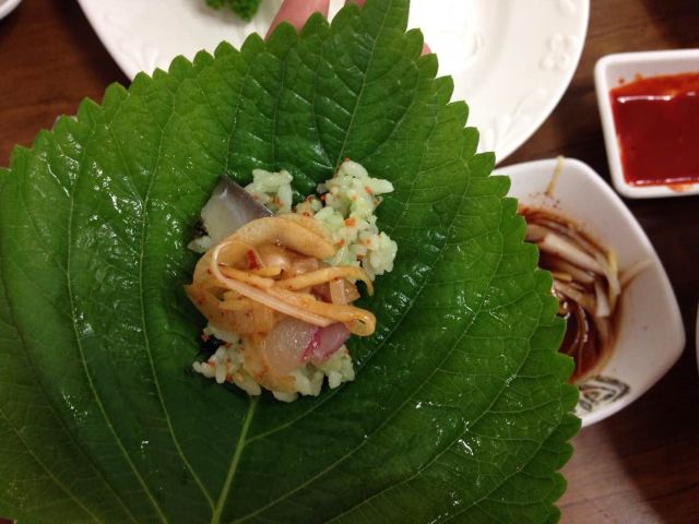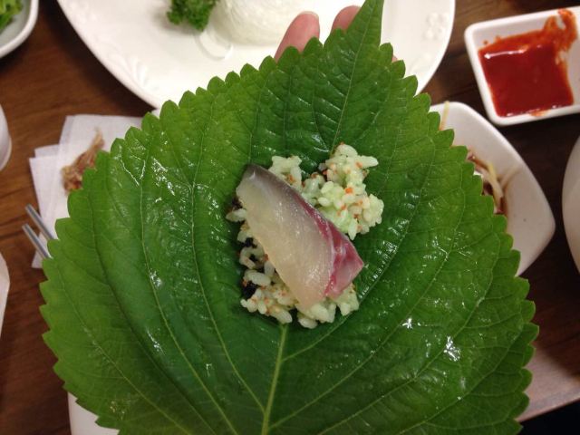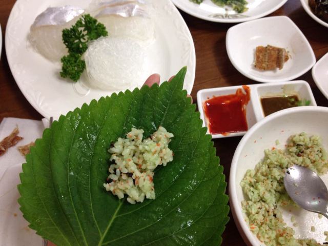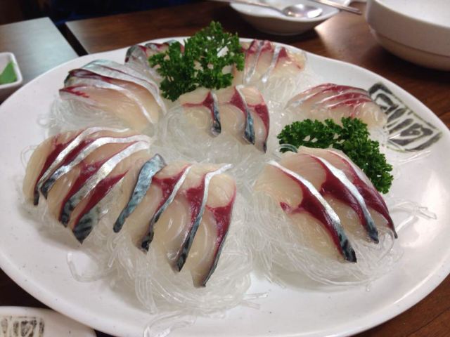 这家鲅鱼 刀鱼生鱼片店极力推荐 就在济州岛边上的牛岛,济州岛的特色鲅鱼生鱼片的吃法 芥末鱼子拌饭+芝麻叶+一片生鱼片+洋葱[色]然后就包好一起放到嘴里[偷笑]