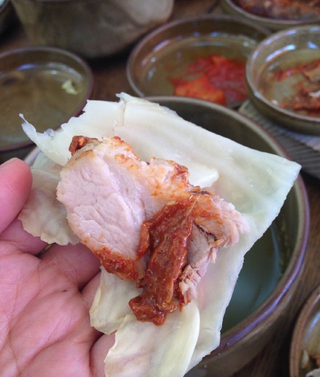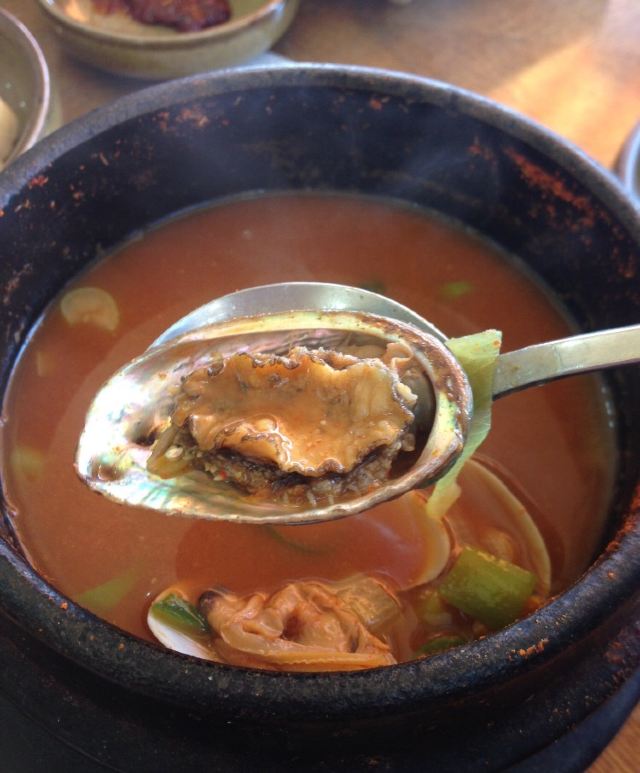 店里面积挺大,一边是桌椅,一边是韩式的地板。推荐鲍鱼石锅汤,汤里有鲍鱼、龙虾和贝壳等,价格很适中,附带的小菜也很丰富,十分下饭。