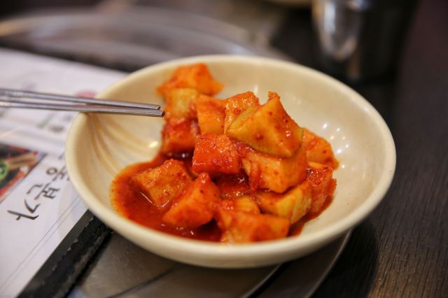 位于莲洞的炖排骨餐厅,将大块牛排骨浇上满满的泡菜汁再配上微辣的烤肉酱,汤汁非常浓郁,有点像稀释的泡菜汤。锅里还有金针菇、土豆、白菜等配菜,非常丰富。