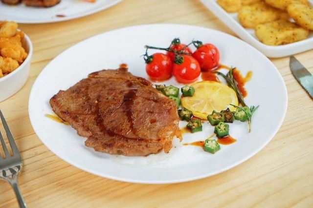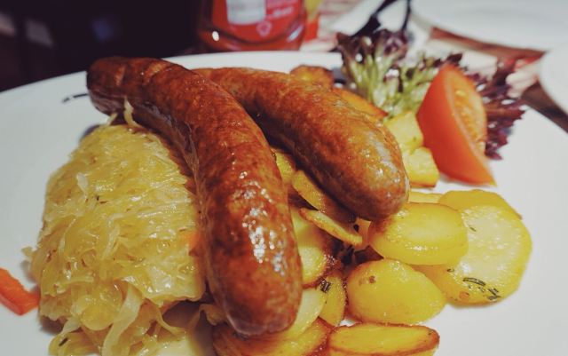 烤猪肘,烤肠,青口贝,肉眼牛扒,牛肉卷,Jägerschnitzel,绿酱,什菜汤,烤鸭胸,Kabeljaufilet,Gebratenes Lachssteak,Pikantes Reisfleisch,土豆料理,苹果酒,啤酒,酸菜排骨