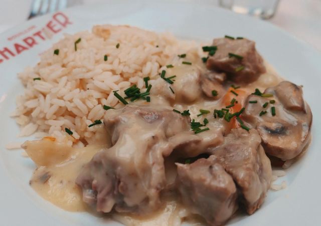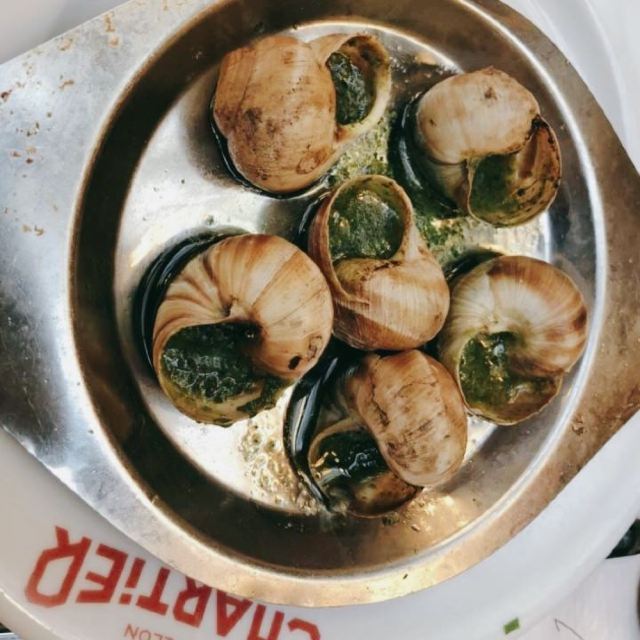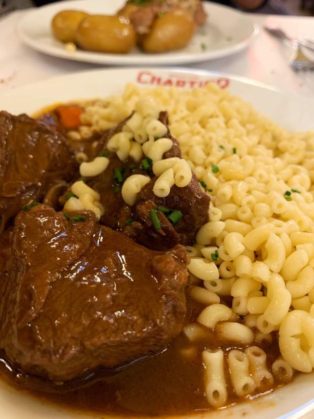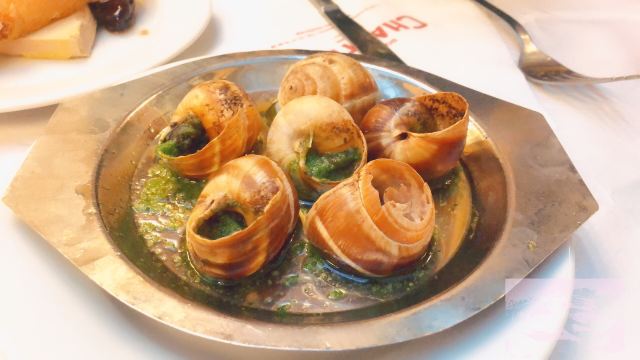 没有蜡olling1⃣2⃣Le Bouillon Chartier 这家中文叫做能人居,一家平价百年巴黎食堂,不到20欧就能吃到的正宗法餐,老火车站风格的装修蛮有意思的,气氛也很好。周日一个人去的,略过了超长的排队队伍就直接进去啦,跟一家三口超级nice的本地法国人拼桌~还教我怎么用蜗牛钳子~ 🐌法式蜗牛 6 snails 前菜选了最经典的蜗牛,青酱的调味总不会错,不过第一次吃蜗牛最让我惊艳的是肉质,弹牙又细腻,值得上瘾 🍛经典炖牛肉 Traditional beef stew 选了菜单上set menu里面的炖牛肉,觉得也蛮好吃的。浓郁的白酱加上牛肉的软嫩,超级香~不过吃到后面会有点腻。