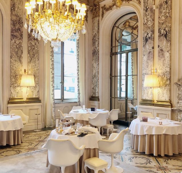 餐厅位于杜乐丽花园旁的茉黎斯酒店内,受凡尔赛宫设计风格的启发,餐厅宛如宫殿般富丽堂皇。推开泛着金色光芒的大门,优雅的水晶吊灯、精致的浮雕、细腻的壁画便映入眼帘,仿佛将食客们带入美丽的殿堂。从前菜到主菜,甜点到酒品,甚至餐具设计都极为精致,整个用餐过程宛如一场艺术盛宴。