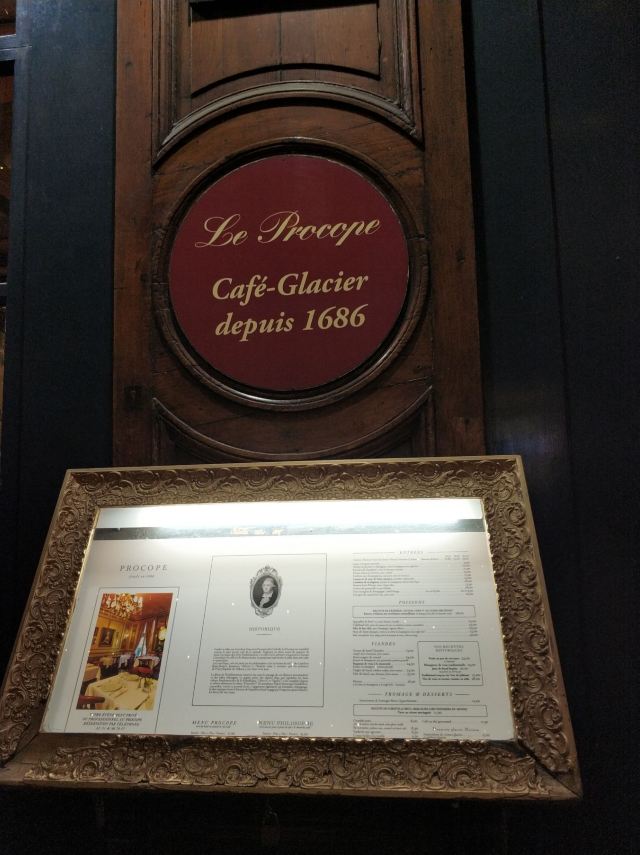 Le Procope是法国最古老的餐厅,建于1686年,它同时也是世界上第一家跟文学紧密联系的咖啡馆——在过去的200年间,伏尔泰、莫里哀、巴尔扎克、雨果等人都曾是常客,餐馆墙上还挂着他们当中很多人的油画。传说拿破仑年轻时没钱付账用帽子做过抵押。 餐厅的暖色调让人感觉很温馨,进门之后橱窗里真的摆着一顶拿破仑的帽子。目前因为盛名之下,每日用餐的人都很多,所以服务有点跟不上去了,所以在这里用餐要有足够的耐心才行。