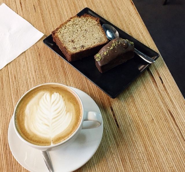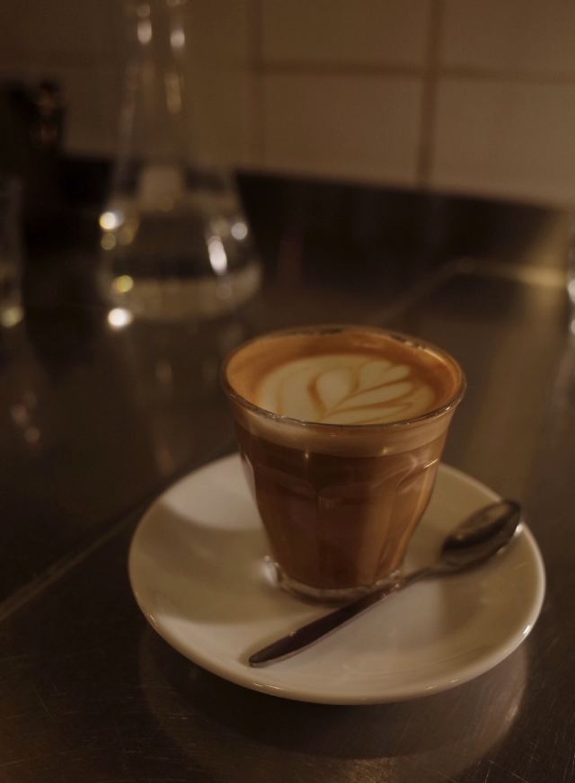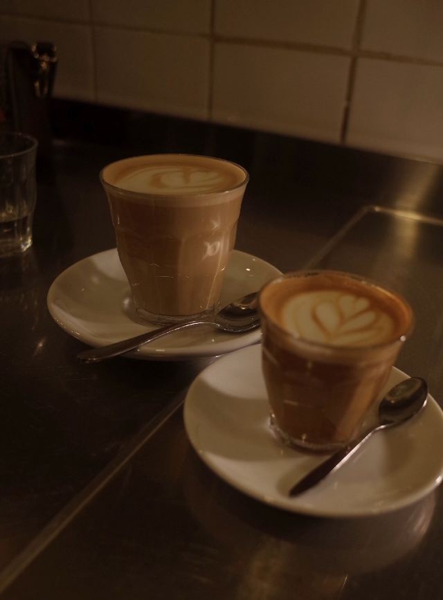 摆渡修行进入咖啡店之后坐在了中间区域的"实验室吧台",昏暗的灯光下种植着绿色植物,感觉很像坐进了一间小实验室,而实验烧杯一般的盛水容器更增强了这种感受,虽然是工业风的装修,但却又不同于一般的工业装修,极具Coutume自己的风格。我们俩坐在那儿喝咖啡,感觉chill中带cool是怎么回事... Coutume也烘有自家品牌的豆子,并且给法国各地的咖啡馆供应豆子,即使这样也没有降低他们对自己咖啡店里咖啡出品的要求。 早上喝完Flat white,下午来和迷你版本的Cortado,依旧是令我着迷的一小杯奶咖。Coutume家的风味更偏酸调,然后后味呈现出来的甘甜感实在太令我惊喜了,豆子新鲜是必然的,咖啡师对比例的掌控也很强,小小的一杯里还给我拉出了一朵花儿来,我当时就真的爱上。仿佛让我回到了在杭州的Funky soul家喝flat white的感觉... 当时就在朋友面前表现出对它的赞美,我朋友也有说好喝,和她之前随便买的一杯咖啡确实会有不一样的口感和风味噢!