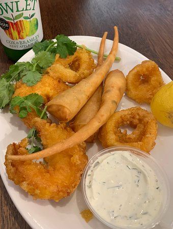 炸鱼薯条,炸虾卷,烤鸡,鳕鱼配薯片,Battered King Prawns,洋葱圈,Mushy Peas,Rock,Plaice,COD
