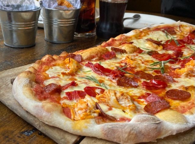 鲁树良这家饭店类似国内的必胜客,主食以披萨饼为主,配菜有洋葱圈,烤鱿鱼圈等,比较符合小朋友胃口。
