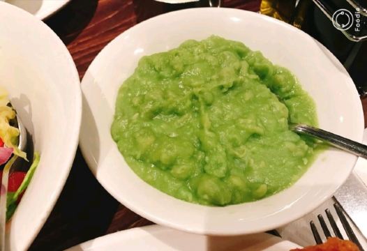黑胡椒鱿鱼,炸鳕鱼,炸鳐鱼鱼翅,英式茄汁黄豆,豌豆泥,希腊沙拉,炸鱼薯条