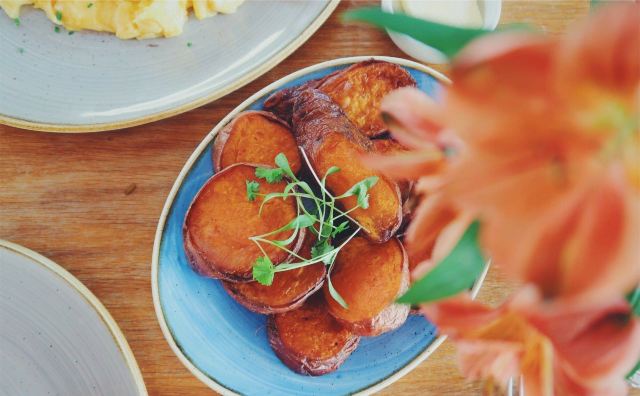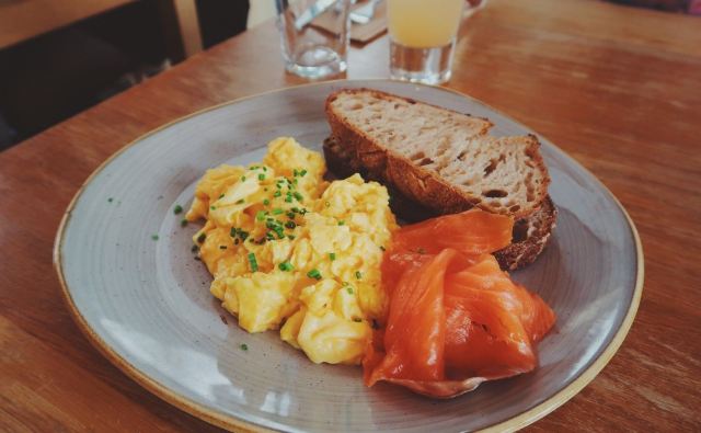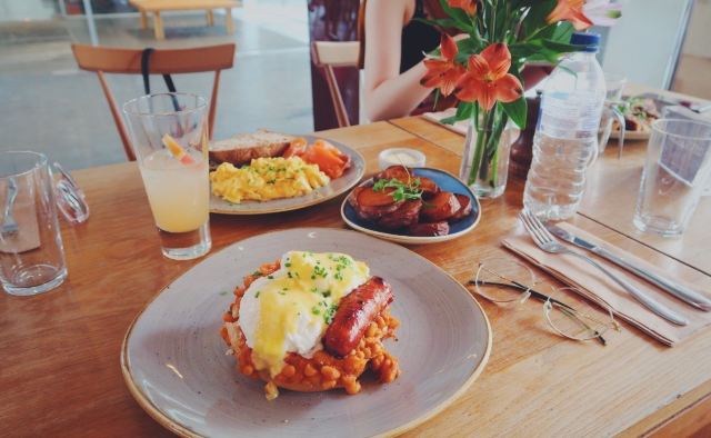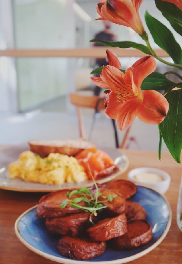 The Table CaféThe Stack|没错!冲着这道来的 集齐了我的各种爱 番茄焗豆份量给的实在是慷慨!铺满了两层!再来就是一直很爱的贝果作主食。个人觉得特别之处在于这款里面的贝果比一般的要更松软 烤了之后很香 搭配西班牙香肠、火腿和两颗水波蛋!这份量真的无敌了 而且火腿丝吃起来竟然有肉松的感觉欸~ 觉得肉类吃起来有负担的 他家最近新推出了素食版the stack 感觉也不错。 Strawberry French toast|这道是新出的!貌似好久没吃法式吐司了!搭配都是很经典的了 草莓酱、香草冰淇淋 倒也没什么太大新意。但吐司的口感把握的非常好!肉桂风味的吐司表面略微酥脆 里面则较为松软。整体也很喜欢啦~ Scrambled eggs&Oak-smoked salmon|中规中矩的搭配却依然每一款食材都满分~蓬松的炒蛋和酸面包就是经典搭配啦!橡木熏制的三文鱼别有一番风味~其实三款食材都很有来头 一点不马虎,比如酸面包就来自Borough market的Little Bread Pedlar Sweet potato wedges|想吃甜薯就选了个配菜。不是条状而是切成了块状。边边烤的脆脆的~软糯又香甜