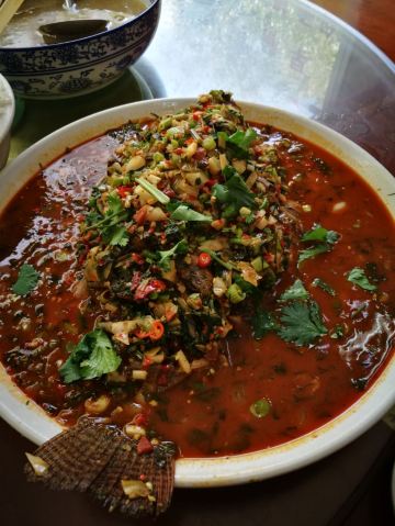 从安宁明珠大酒店走过去一路上坡,走了大慨15分钟左右吧,到餐馆一看,在米易还算装修得较为规矩的酒店,里面大慨有7;8张圆桌,卡座有两张吧,菜品的价格相对偏高,老板介绍了一个时令菜,辣炒攀枝花,滑滑的,口感很特别,没有尝试过的可以吃吃,酸菜罗非鱼口味做得不多,一会儿都吃完了,酸菜豆米汤是彝族吃法,我感觉不错,好吃。