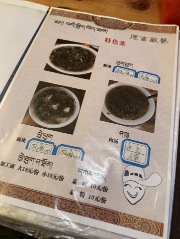 我觉得吃了这顿藏餐,我这辈子应该再也不会吃藏餐了吧,至少我不会主动提出来吃。 原本就心情不太好,加上餐厅卫生间很脏,我去对面菜市场的厕所一样的脏。 而太阳又是特别的火烈,所以很毛躁很不舒服。 还好没点什么,不然真的是全浪费了。也可惜呀! 好吧,红原的餐饮都感觉卫生堪忧啊,看着就会没什么食欲,所以建议能不到这儿吃饭,就尽量不要到这里来,换个地方落脚吃饭吧。 【牛肉包子】 10个起点。我的天,吃了第一口我就受不了了,那闷好油腻,还有一点臭烘烘的味道。我用桌上的辣椒油蘸了吃,还是无法接受,所以勉强就吃了这一口而已。 【牛肉饼】点了,下单了。老板后面说没有了。 【粉汤】就一碗粉丝汤,然后上面有几片牛肉。我的天,那个汤像是洗锅水。牛肉比较老,不好嚼,我也就只是一样吃了一口而已。 其他的,还好没点了,不然真的浪费钱。 恩,个人口味问题哈,仅作参考。我猜这家还确实是当地地道的藏餐店,因为生意很好,并且全是当地人,还有一小部分的游客。 态度还是挺好的,很和善的样子。
