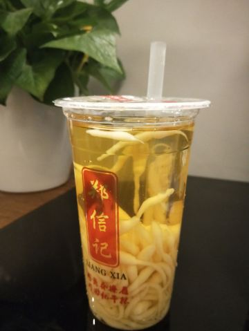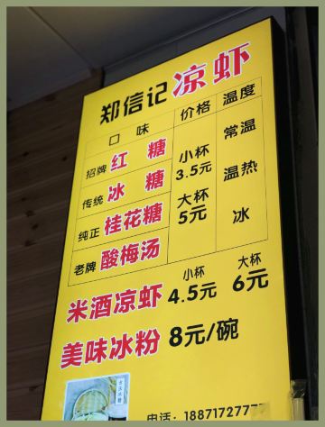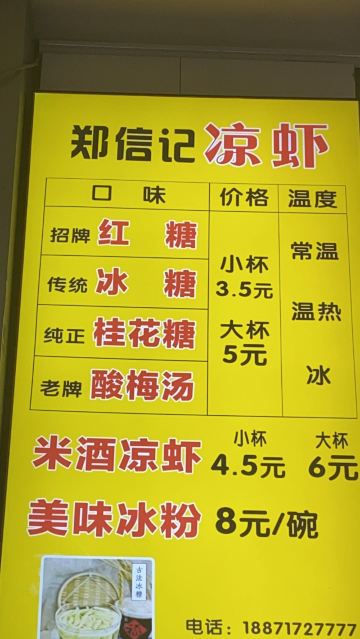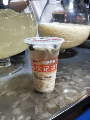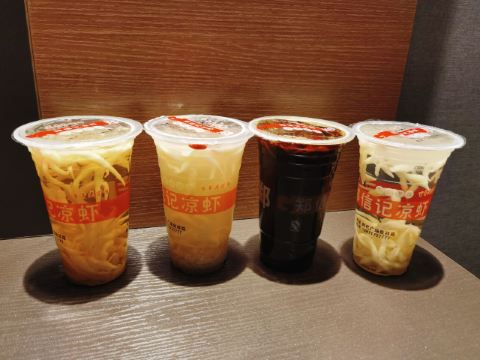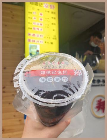 🙋🏻♀️ 宜昌老字号,位置开在小巷里面,隔着大门有另一家凉虾,这家生意看着稍好一些,冲鸭。 🥤 「招牌老红糖味」点了大杯的,味道就是红糖水哈哈哈哈,里面的凉虾软QQ的,味道还可以啦,凉虾吃起来好玩哈哈。 【服务】 店门口摆着白凉虾和黑凉虾,还有龟苓膏啥的。老板还算热情嘻嘻。 🌿环境: 街边小店要啥自行车,买一杯接着逛呗。