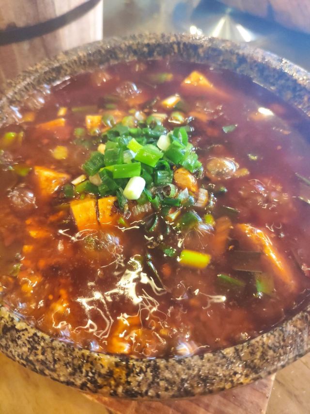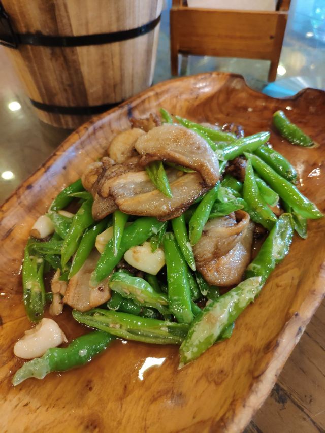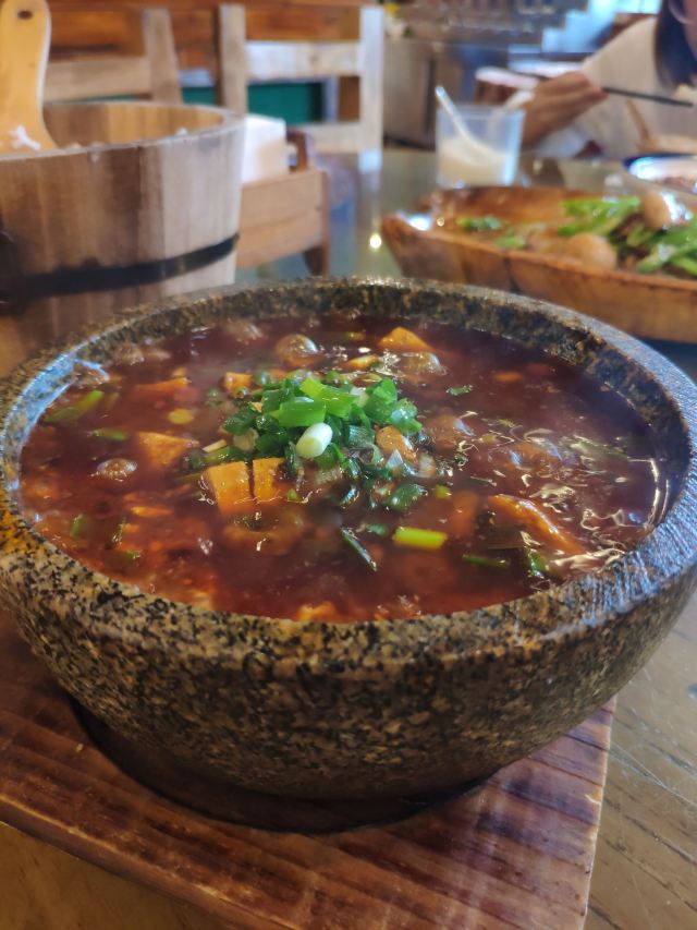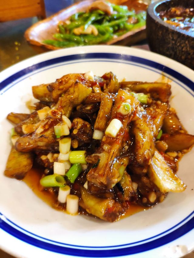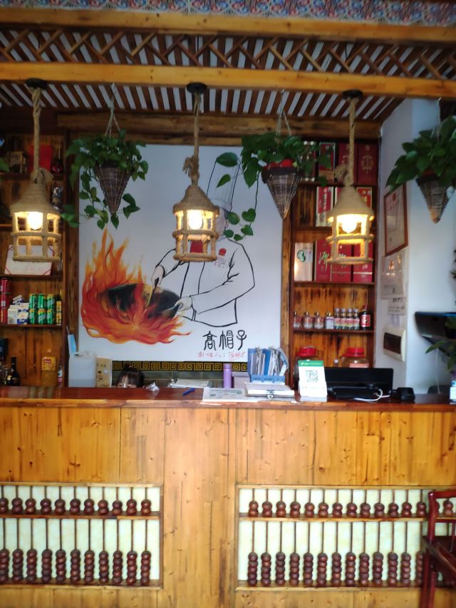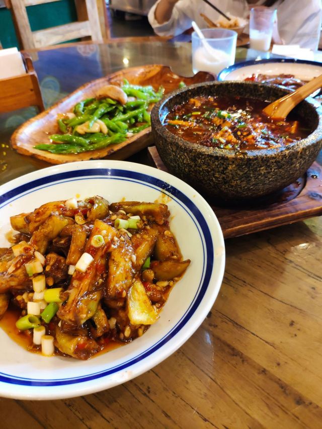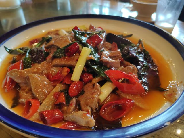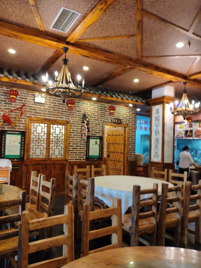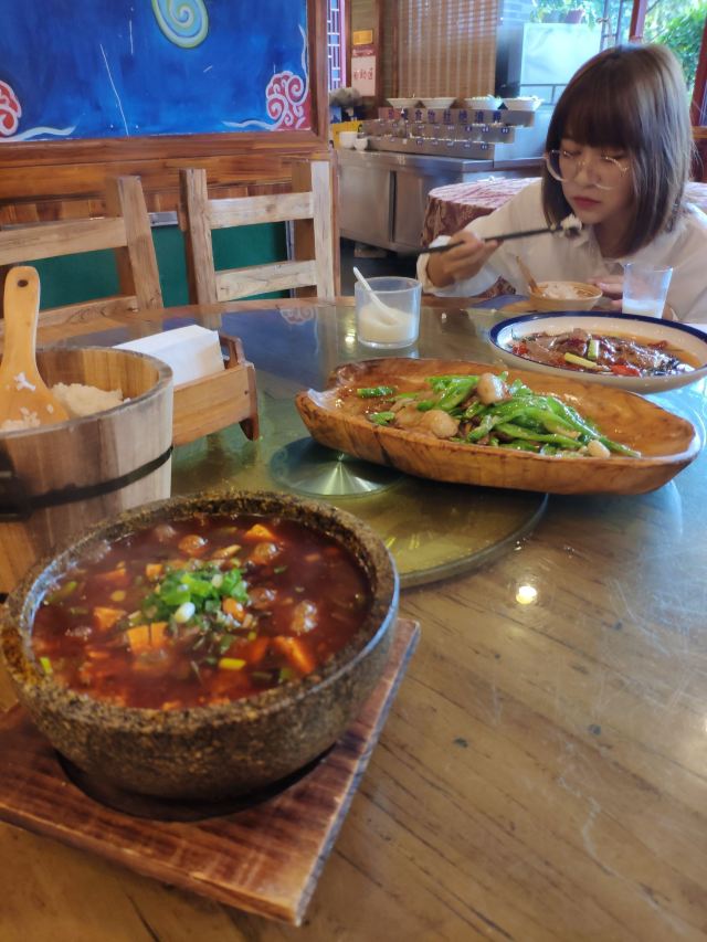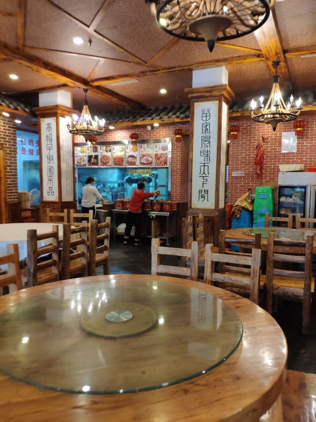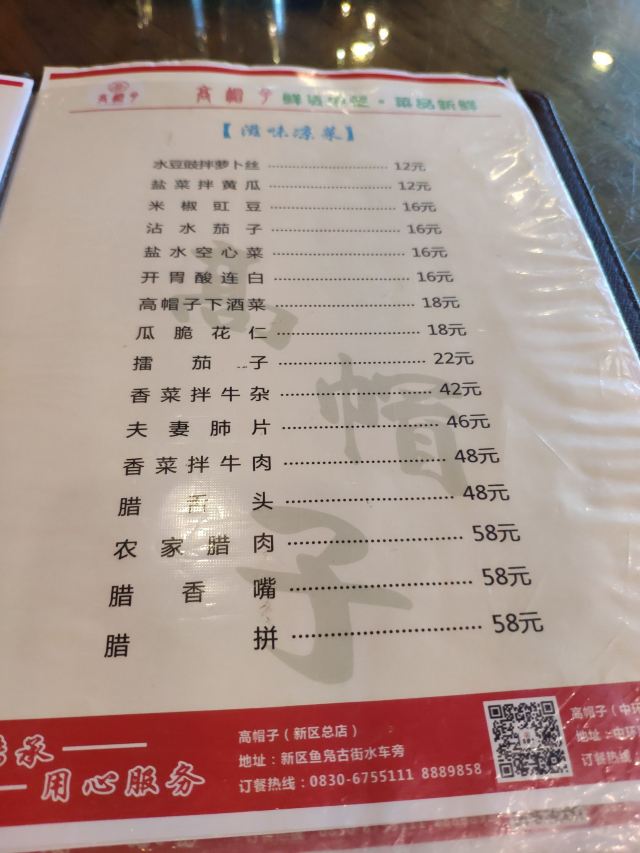 在叙永想找个地方吃午饭,这一圈有很多餐饮,不过中餐馆比较少。高帽子看上去像个中餐馆,进店看上去确实是中式江湖菜的装修风格。有好几个包间,大厅全是大圆桌。看了价目表,价格偏高。点了两个荤菜两个素菜,意外的是味道挺好的,鱼香茄子尤其要赞一个。还送了一小壶花生浆,添加的话30元一小壶还是有点贵。吃点家常菜还是可以的,就是没有想到小县城的消费比成都还高。