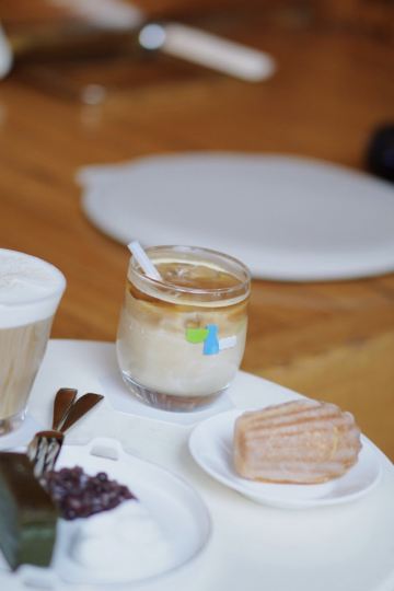 摆渡修行复古文艺的屋外 清冷明亮的屋内 店里不仅售卖自家发行的杂志和书籍 还有杯子 帆布包等周边 一家咖啡馆能开到出了周边 那必定是要来瞧瞧的 新鲜红豆糯糯嚅嚅的 看起来颗粒分明 放入嘴里却是磨砂质感 太喜欢了 抹茶蛋糕切片 湿润绵密 入口即化 通病是南韩的抹茶都带甜 其实好甜口的话 这个程度的抹茶是高水准的出品了 抹上新鲜打发的奶油 一并含在嘴里 于舌尖缠绕 美妙极了 只想高喊: 大发!!! 咸味的艾斯班拿也出乎意料的好喝 做底的Espresso用了中度烘培的豆子 奶霜的盖层轻盈透气 顶上撒了肉桂粉 劲道不强却自带余韵 香甜不腻 咖啡豆由大名鼎鼎的Libre供应 浓缩大多用的是混合豆Bad Blood 有桃子的甜度 和柑橘的酸度相平衡 水果层次明显 拿铁也是明亮色调 美中不足是奶咖直接盖过了花香 豆子用作手冲或许更为合适 贝壳外表 糖霜表层 玛德琳内里质地稍微松散了些 黄油味道不重 偏甜
