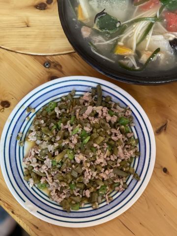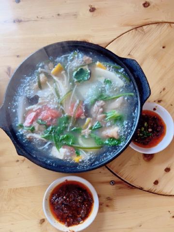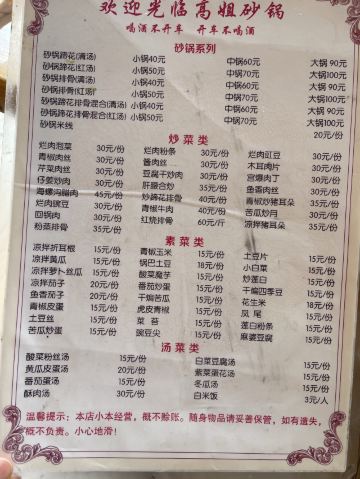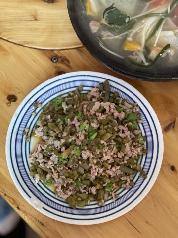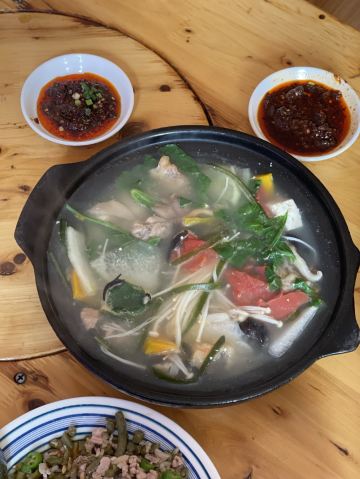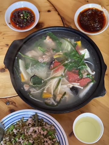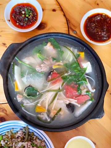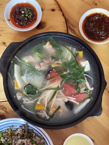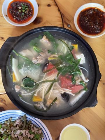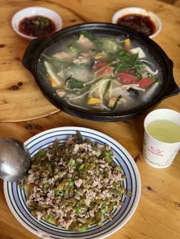 在川西这些地方,我对食物没啥要求,干净卫生就好,每天保证一定的绿色蔬菜。 藏餐原本我是有兴趣的,但是前两年去一家评价很高的藏餐,被脏乱差的卫生间,还有看起来不太干净的菜肴给惊吓了,自此再也不想吃藏餐了。 所以这一路上我买的都是吃的川菜。 这家砂锅是原本计划的牦牛汤锅没开门,所以临时在对面选了这家替代。 【蹄花排骨砂锅】小份白汤 40元 就是一锅乱炖,杂七杂八的,配了蘸碟,所以还是比较下饭。 味道普普通通吧,但是本身就只是为了吃顿饭,没啥期望,所以觉得还不错。 上菜也挺快的。 【烂肉豇豆】30元 导哥点的,因为前一天看综艺节目他就看上了电视里的那一盘烂肉豇豆。 这顿饭就很坚定的要来一份,实话说看起来就普普通通,但是他吃得很开心很满足,说很下饭。 恩,随便吃吃嘛,店里两位大姐态度还是比较热情的。