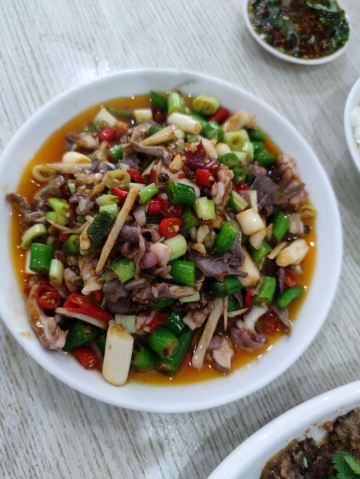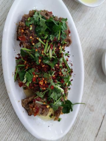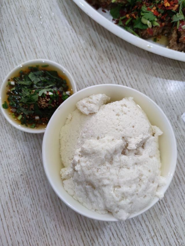 中午去这里吃的豆花饭,看网上介绍的火爆双脆,是用郡肝和猪肚混炒的,猪肚煮的比较生,切成花条再和郡肝切成的花一起炒,另外还点了蒸牛肉,和豆花,豆花的蘸水里面有霍香的叶子,味道不错。店家门口还专门有卖豆花蘸水的。