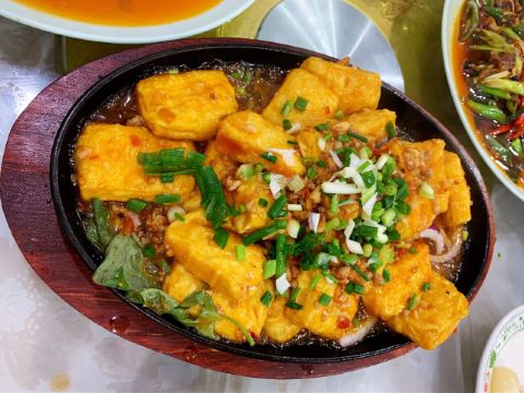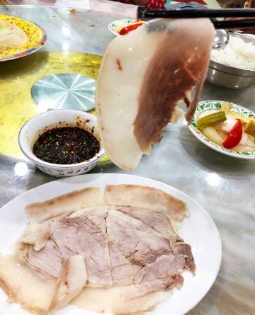 这家店评分虽然不高,但是到泸州一定要尝尝,白肉绝对没得说,蘸水分为两种,麻酱的和麻辣的,味道都不错,跟李庄不同的地方是还有一种同样吃法的肉皮,花刀切的很漂亮。包浆豆腐也是必点菜之一,火爆肥肠由于是鲜肥肠汆水之后直接爆炒,需要好牙口。