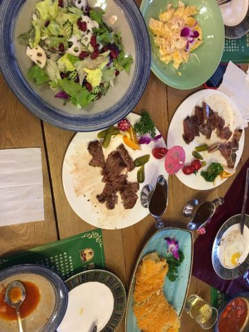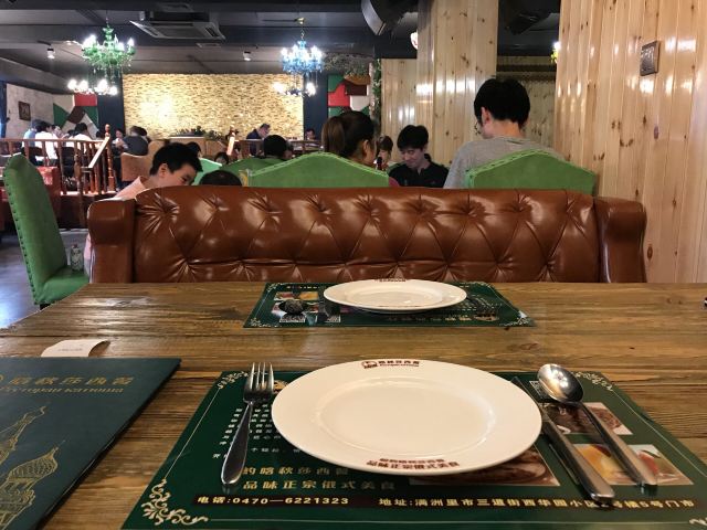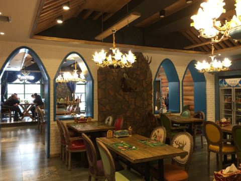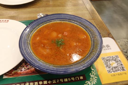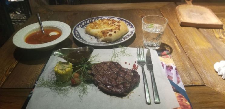 在三道街西侧与文明路交叉口,与某网红西餐店相距不远,欧式风格装修,餐厅环境不错,服务很好,五一期间游人顾客不多,服务更周到细致,菜品口味很好,偏清淡,摆盘讲究、颜值高、卖相好。种类与其它西餐厅差不多,大同小异,红菜汤、牛排、奶酪饼、沙拉、罐牛肉、大肉串、香煎土豆片、煎鲽鱼……