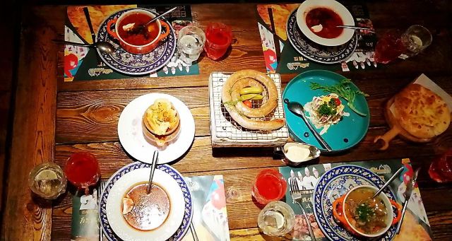 瓦罐俄式牛肉,皇后沙拉,乌克兰红菜汤,俄式碳烤香肠,卢布里奶酪包,西米丹奶酪面包,基辅罗斯烤鳕鱼,kebab,俄式红菜汤,红菜汤,火爆辣鸡香蒜披萨,格瓦斯,男孩沙拉,西米丹奶酪饼,法式铁板羊排,香煎鳕鱼,奶酪饼,芝士面包,香煎土豆片,排骨串,红石榴气泡水,俄式香肠,金枪鱼沙拉,奶酪面包,烤羊排串,鸡肉串,俄式西餐,战斧牛排,芝士排骨,土豆泥,自酿啤酒
