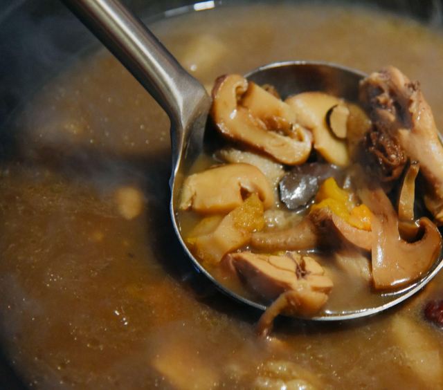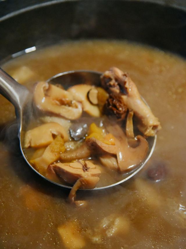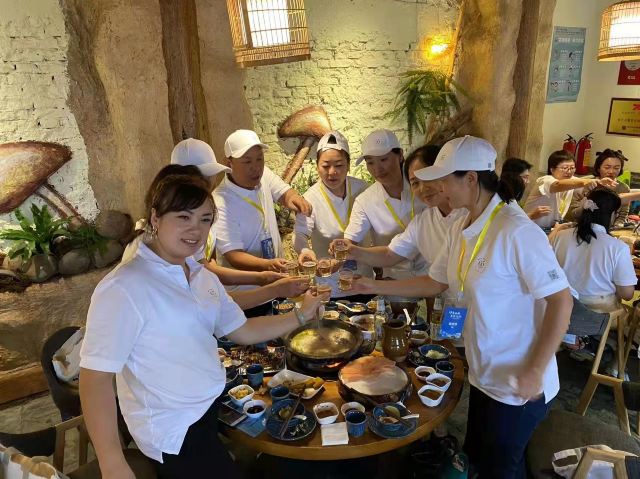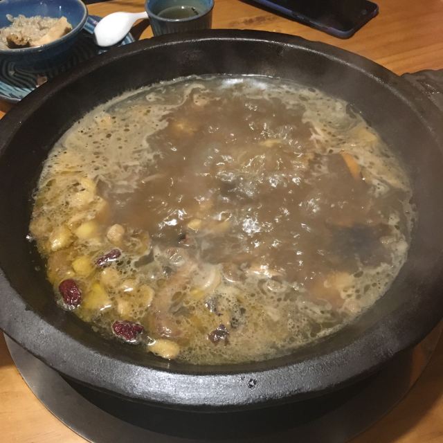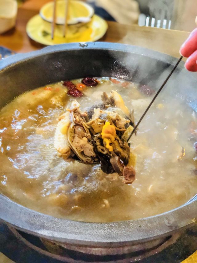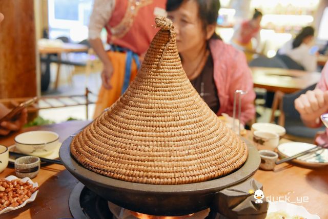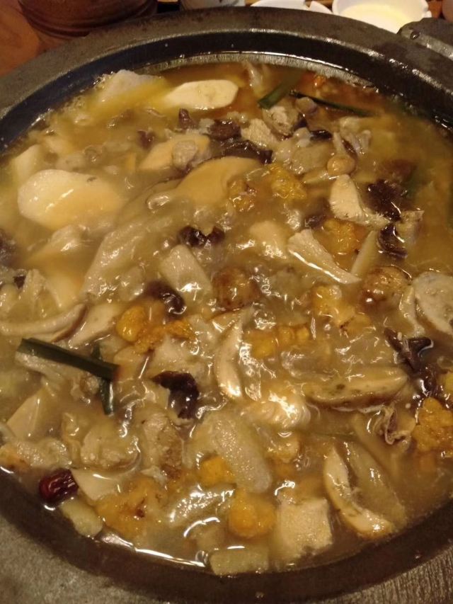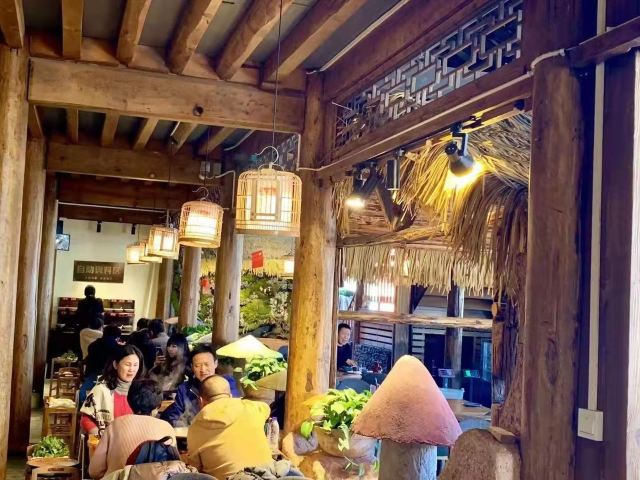鸭鸭爱生活再一次的丽江行,第一站仍然是丽江古城,恰逢雨季,大雨滂沱,只能先去寻觅吃的。 石锅渔·山珍馆,位于四方庙会里面,装修色彩第一眼就爱上,打造了浓郁的少数民族风情,而店内到处是菌菇的图案。 来了云南就是要吃菌菇,作为原产地,无论是品质或者价位都比厦门好上许多。这家主打的便是野生菌菇锅。4个人点了一份398的套餐,相当划算。 汤底是老鸡半只,搭配12种菌菇,常见的竹荪、牛肝菌、羊肚菌、松茸、黄牛肝菌,还有从未吃过的金耳、猴头菇、老人头、皮条菌、荞面菌、谷熟菌,上桌服务员都会给你介绍。草帽当锅盖,在这里也见识到了! ❗菌菇下锅,配有定时器,一定要定时器响了才能吃。 凉菜四拼,包含茨菇、荞片、山珍菌、煎凉粉,第一次吃到凉粉用煎的,颇为惊喜。 水性杨花,一种云南特产的野菜,据说在泸沽湖盛产,也是第一次吃到,爽口。 豆面汤圆、山珍包、纳西黄金洋芋,都是手工菜,浓浓的纳西风情在里面。 菌香饭,主食搭配,用野生菌去炒饭,更加香,连一向不爱吃米饭的我都吃了不少 再搭配一杯店内自酿的梅子酒,简直完美! 一锅吃下12种野生菌,性价比超高,值得推荐!