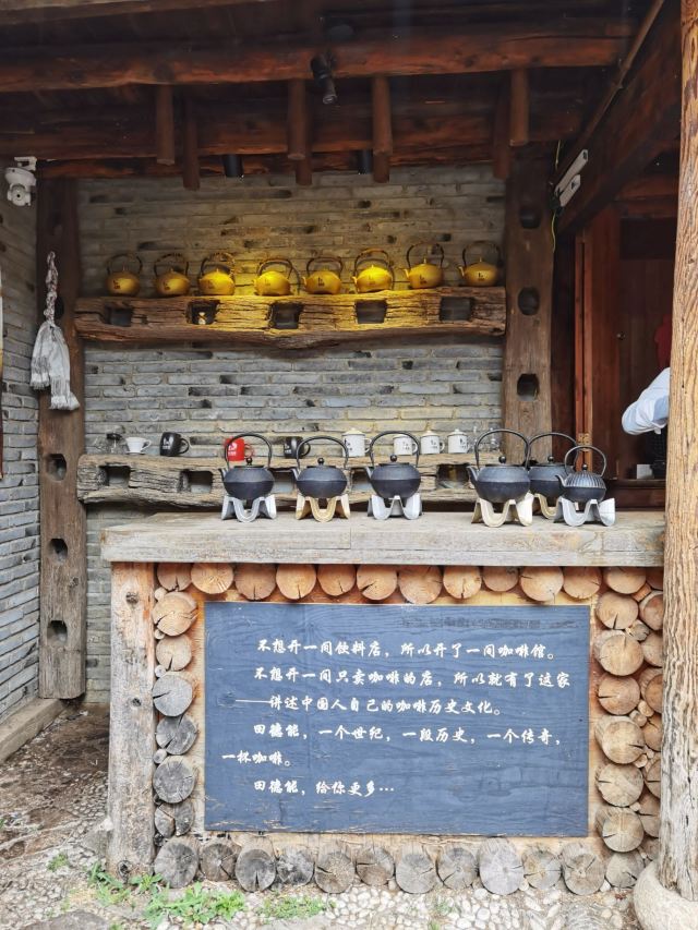 Helen晓世界《4000公里一个月环游云南》 说实话对咖啡☕️并没有什么执念,但下雨降温的午后,一壶在面前缓缓炉火煮开的咖啡,还是很温暖的。 现在束河古镇感觉还是比较萧条,路过的店铺大多门可罗雀,不过这家居然快坐满了,看来“中国咖啡鼻祖”的号召力还是很可以的。 招牌|铁壶咖啡^78元单人份,不算便宜,不过比起机器制作,我还是挺享受这种小火慢煨的感觉。咖啡煮制过程中是不会上杯子的,有点耐心,等煮好了,店家自然会送上来,再静置三分钟,就可以享用了。 【环境】店里既是咖啡馆,也是一方小小的纪念馆,上下两层都有座位,貌似老板一个人张罗着,还有三只喵依偎在一起取暖。客人们都挺安静的。 不过洗手间的卫生情况不太理想,如果能改造一下更好。