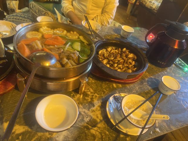茉莉花炒蛋,纳西糯米咸鸭蛋,田园腊排骨汤,纳西藤椒鸡,火瓢牛肉,松茸汽锅鸡,黑鸡枞煎雪花牛肉粒,木府金汤雪山鱼 ,菌菇汤,石锅香烤包浆豆腐,丽江粑粑,干锅牦牛肉,丽江三文鱼