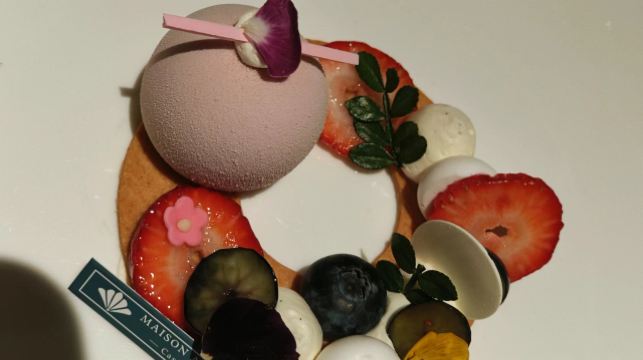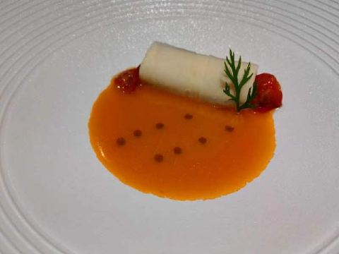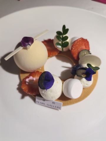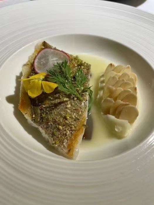 牛肝菌脆皮黑斑鳕鱼柳配京葱奶油,香煎鹅肝,M9西冷牛排配烤时蔬,海鲜浓汤,红柚雪葩,鹅肝慕斯,银杏露雪葩
