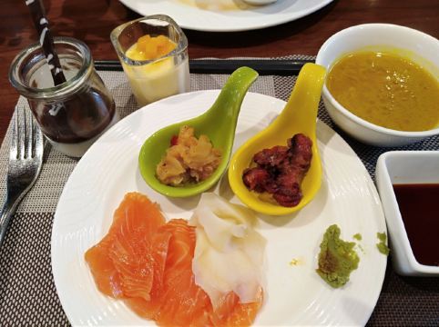 文凡状元别院餐厅,位于酒店听水池畔,远望青山如黛,近看池水清透,赏心悦目。餐厅菜品一如既往的高品质,烤羊排倍受客人欢迎,广式叉烧,煲仔饭非常地道。甜品吸引我去一一品尝了一遍,回味无穷。