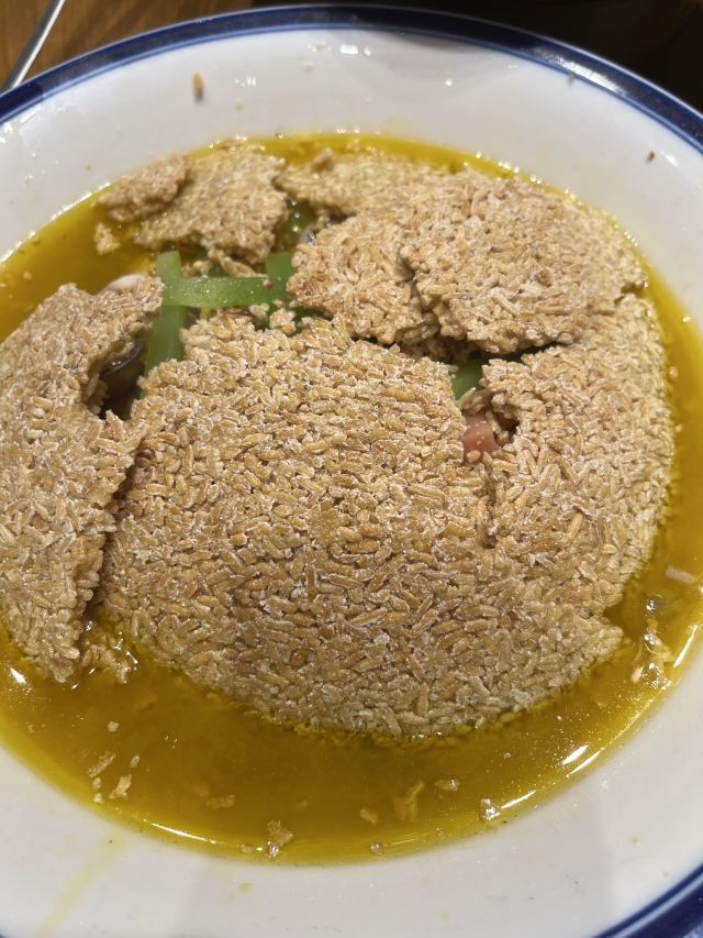 离开贵阳的前一天去甲秀楼逛逛,晚餐安排在了附近的醉苗侗。团餐上菜速度很快 餐具有点特色,有一个盛菜的盘子像铁锨 酸汤鱼,汤酸酸的,一路领略了贵州的酸 那个锅巴有点特色,看着整个的扣在餐具中,敲开后沾着汤汁很好吃,里面有莴笋等。 有点像粽子的,里面是糯米夹的肉
