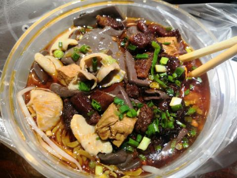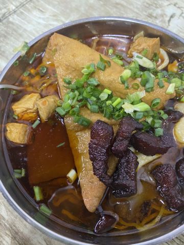 YoYo_0J2S2E4K好巧,走着走着就吃到这家的肠旺面早餐。面条像广东的银丝面,里面还放了豆芽。我们选了13元的面,什么都有,鸡肠,血旺,油渣,鸡肉,豆干。可能是个人口感问题,我觉得这个面基本没有什么惊艳的。奇怪的是,吃完了争个上午肠胃都怪怪的,可能是有点上火
