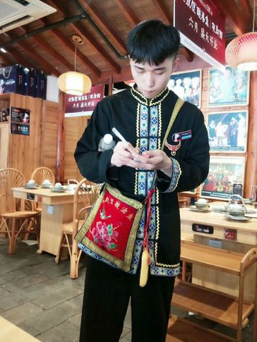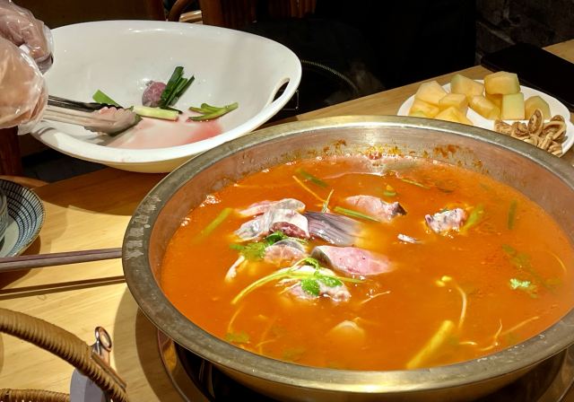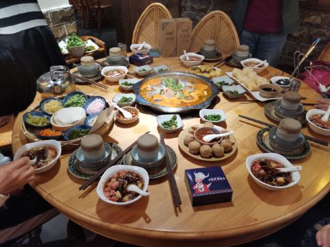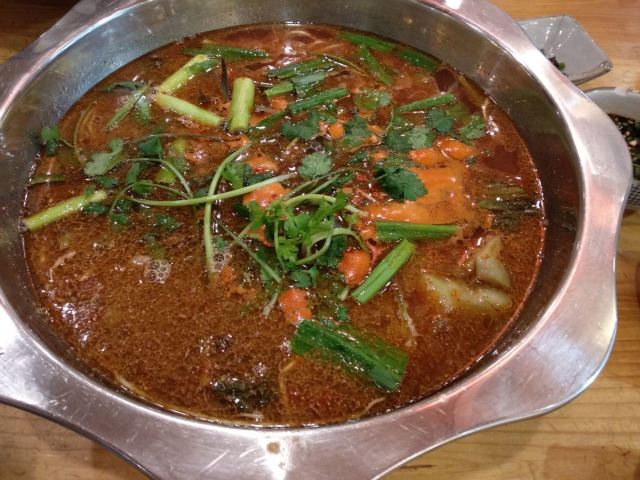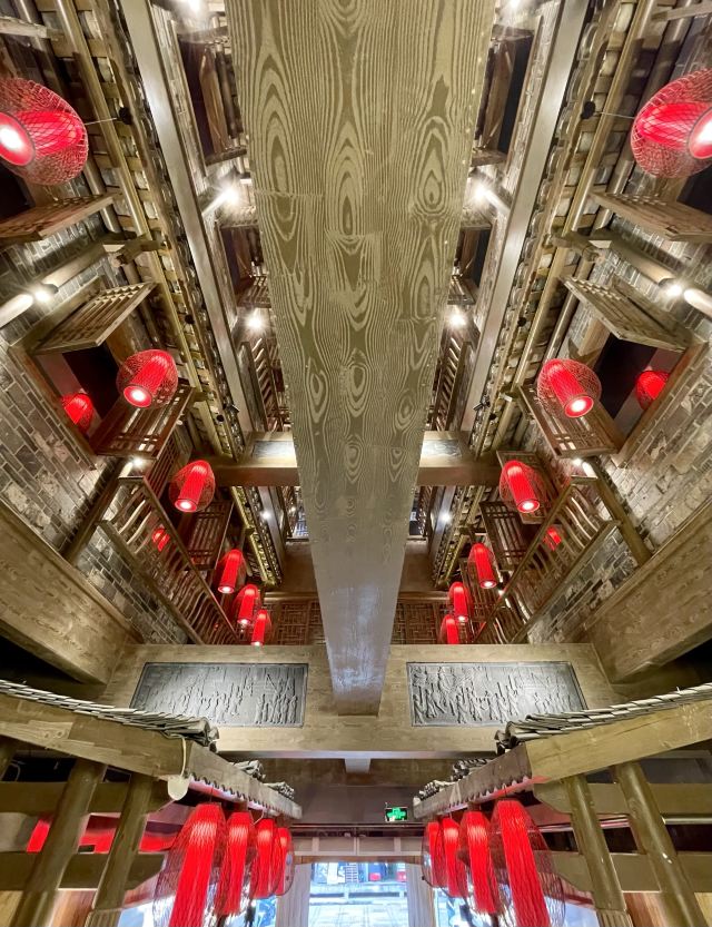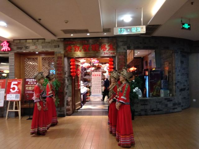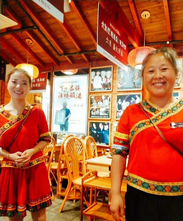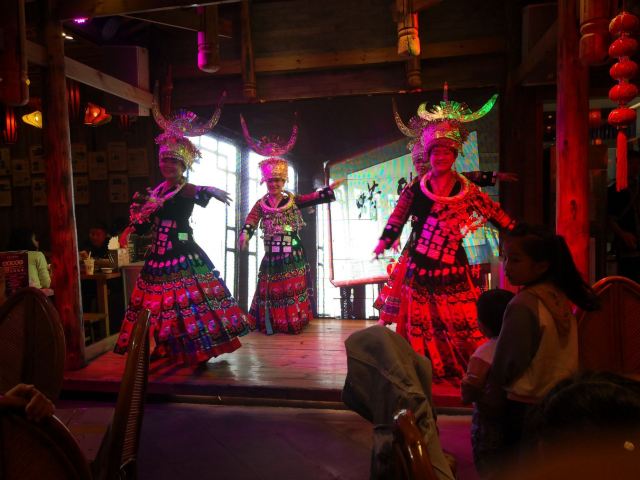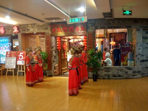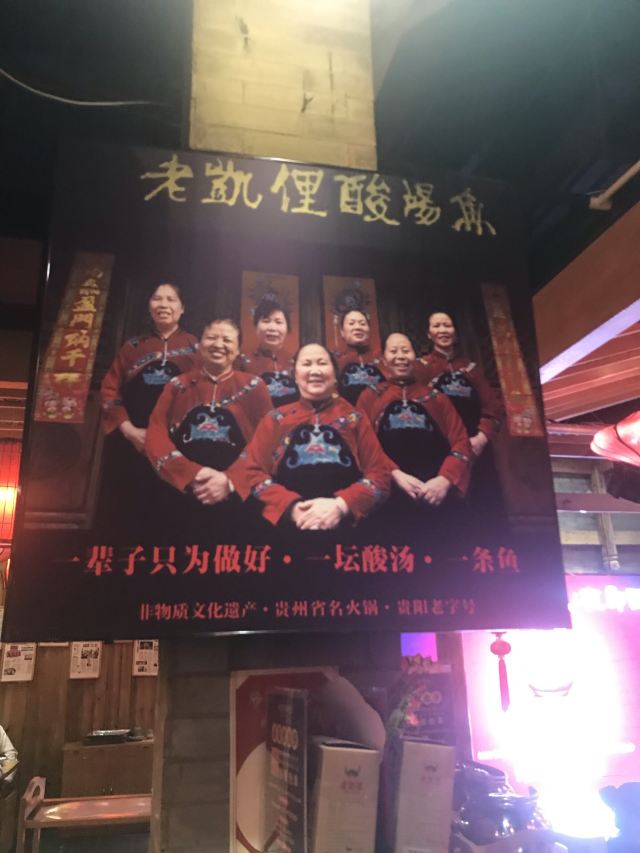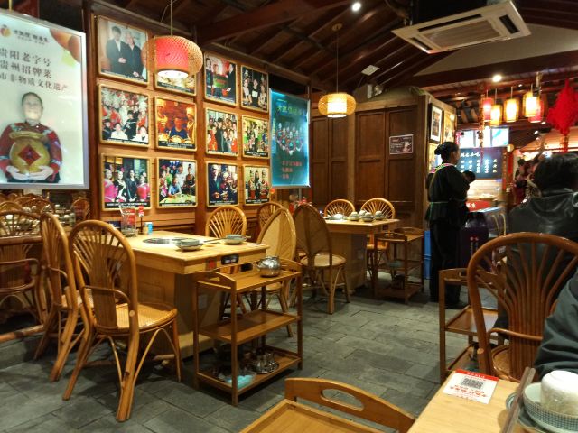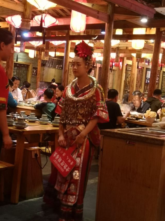 远处可以看到大红色的灯笼,装修风格很有苗家特色,服务员也都穿着漂亮的民族服饰。菜肴色香味俱佳,味道正宗。酸汤鱼是店内必点菜品,也是贵阳有代表性的特色菜。酸汤开胃,鱼肉鲜嫩,味道独特。