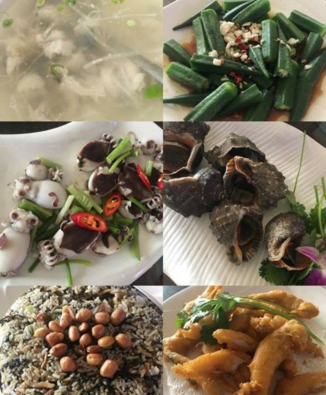 粉丝蒸龙虾,冬归枸杞蒸鳗鱼,葱油小管,白灼香虾,斑节虾,特色海门紫菜饭,海螺,肉沫扇贝,海门土笋冻,蒜末蒸竹蛏,土笋冻,爆炒鱿鱼,香芋饺,芥菜饭,蒸螃蟹,杂鱼酱油水,白灼旺螺,铁板老蛏,鲍鱼炖枸杞,香芋蒸膏蟹,肉末扇贝,开边金昌鱼