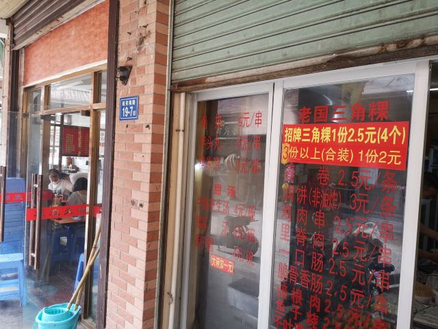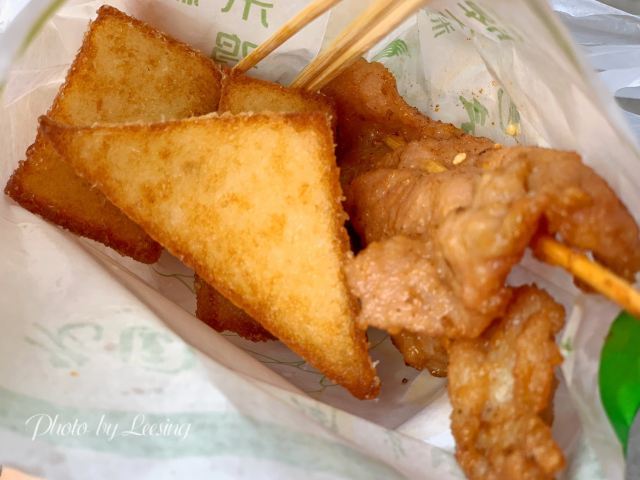 漳州这地带的门面还是比较老旧的,而且也不太显眼,不过还是靠着老手艺深得人心。 老国三角粿当然得尝尝三角粿啦,2.5元/1个?NoNoNo,4个,2.5元/4个哦。现炸的三角粿,表皮金黄酥脆的,里面却是细腻软绵,还可以蘸上特制的酱料,香甜酸辣。 它家除了三角粿外还有里脊肉、春卷、鸡肉串、一口肠等等小食,大家也都可以试试哦。
