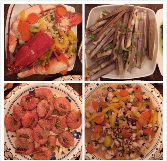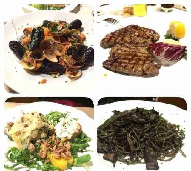 菲力牛排,蜜瓜生火腿,炸海鲜拼盘,烤鱼,墨鱼面,蔬菜沙拉,墨鱼汁意大利面,墨鱼汁意面