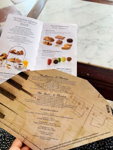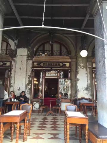 Caffe Florian Venezia威尼斯弗洛里安花神咖啡馆Caffe Florian(弗洛里安花神咖啡馆)创业于公元1720年,这间今年三百年历史的咖啡厅被认为是世界最古老的咖啡馆,更是威尼斯最具代表性的咖啡馆,在那斑驳外表店里所展示的华丽装饰古董家具和画作也是各地观光客朝圣原因之一。 有全世界最美的咖啡馆第二名之名。在咖啡店漫长的历史中,座上宾不乏当代名人、政治家、作家、艺术家等如马克·吐温 (Mark Twain)、查理·卓别林(Charlie Chaplin)丶查尔斯·狄更斯 (Charles Dickens) 丶拜伦(Lord Byron)等名人雅士曾经在此高谈阔论。 咖啡厅户外露天座可以坐拥圣马可广场欣赏美景和聆听现场乐队演奏,体验义大利的优雅,我们去时因为时间有限没办法坐下来喝杯咖啡,但竟在广场听到有人演奏茉莉花这首曲子,倍感亲切。