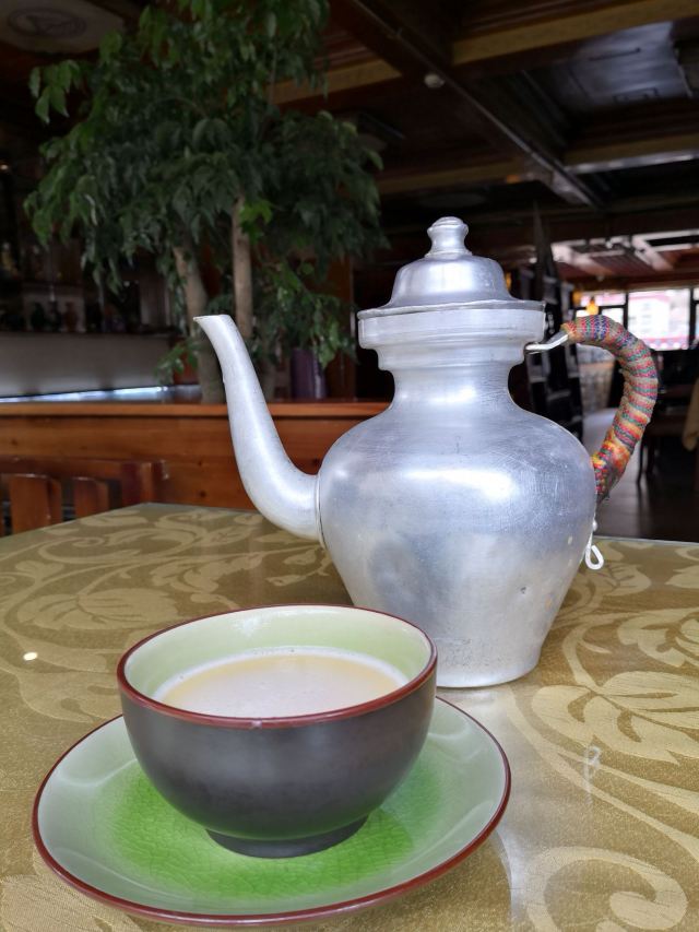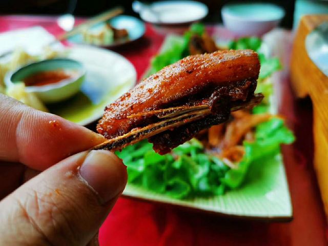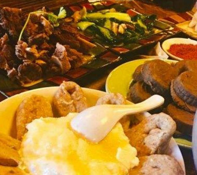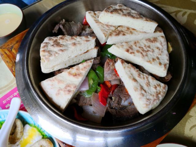 中午在康定吃饭,这家好像是个老字号。进门就能感受到浓浓的藏族风情,入座的时候才十一点半,我们是第一桌,后面陆续而来的食客大多是本地人,一下感觉来对了地方。酥油茶是必点,热的时候很好喝,能缓解高原症状,冷了就不推荐饮用了,不要问我为什么。牛肉盖被就是洋葱土豆牛肉干锅上面盖着饼,土豆是真的好吃啊,又糯又面,高原特色。牛肉的品质自不必说,绝对资格!怕羊肉膻,点了个手抓牛肉,全是硬货,有点整不动了。隔壁桌点的藏式土豆泥和包子,我很眼馋,无奈肚子装不下了。值得一试的一家藏餐,推荐给大家。