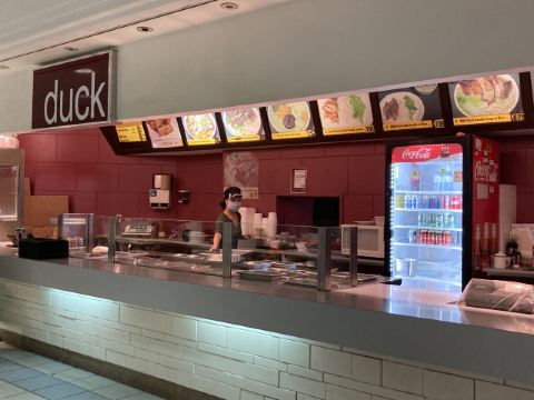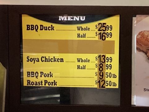 College Park这个购物中心在地铁College站上面,内有一个food court,其中最大的一家餐饮叫Duck。主打中式烧腊,烧鸭25.99刀/个、16.99刀/半个。烧肉9.5刀/磅。