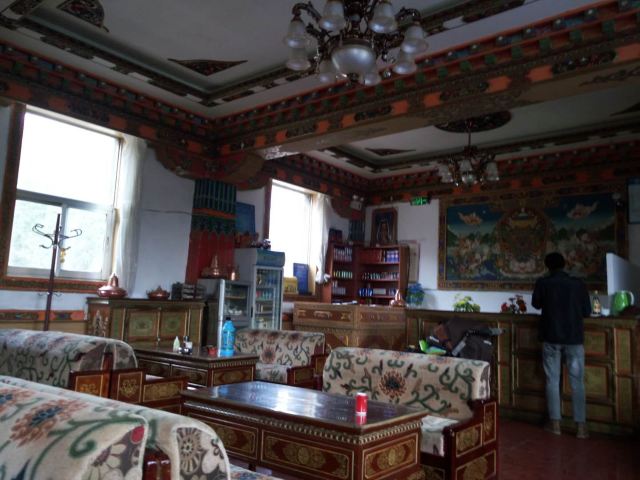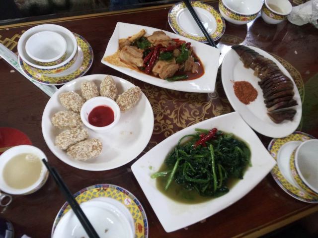 我们中午游览完布达拉后感觉走得有些累,就近来了布宫广场旁的这家餐厅吃饭。此时已过了饭点,几名餐厅服务员站在门前抽烟聊天,餐厅里边没一个顾客,前台一女的自顾自地抱着一小孩玩。咱们自己挑了个能直观布宫的位子坐下等人过来点餐,可落座将近十分钟了也无任何人前来搭理,让咱们面面相觑显得很尴尬,不禁心生怀疑:现在是不是不营业了?我只好走到前台询问是否还做生意,那女的才用生硬的汉语答道:当然做,你们点菜吧。接着就顺给我一本菜单。我马上拿着菜单回座位与另外三人合计了一番后点了四个菜和一壶酥油茶,生怕嫌咱们磨叽,影响他们休息!之后上菜算是快,十几分钟都弄齐了。牦牛舌较嫩,但也不失一些嚼劲,而且入味好,份量也足,好像每份是88元!烤土豆包子外面不烫里面却很热乎,咬下去又香又酥,个头算大、数量算多,价钱不算贵!回锅藏香猪肉做的虽然手艺一般,但肉质还是没得说,绝对是采用的正宗藏香猪肉,价格可我忘了!青菜味道就更一般,不必说了。这里的酥油茶是用热水瓶盛的,25元一瓶,放咱们桌边自己倒。那味道香浓爽滑真不错,反正除了稍微偏甜,感觉比内地任何品牌的奶茶都好喝,只是可惜不好打包(酥油茶如果凉了会结较厚的油垢,需再次加热才能喝)!青稞酒是后来加的,5元一罐,味道清淡,有低度谷酒的感觉,不太爱喝。