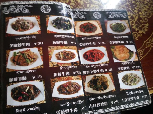 烤牦牛舌,咖喱拌土豆,烤羊排,人参果炒饭,土豆包子,牛肉炖萝卜,甜茶,酸奶,藏式咖喱