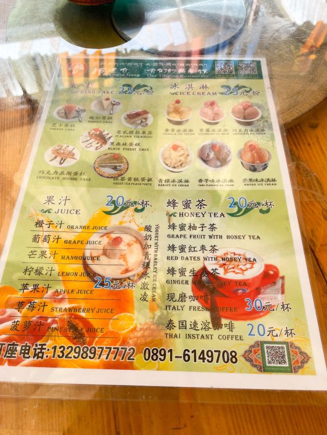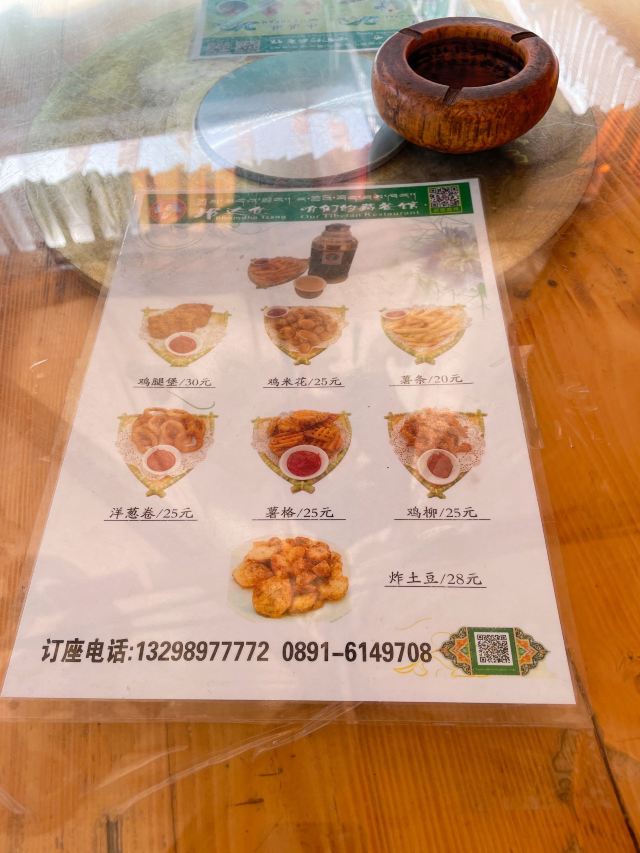 藏式咖喱饭,酸萝卜炒牛肉,炸羊排,藏香猪,藏式火锅,土豆包子,清炒上海青,卡布奇诺,咖啡,炒藏面,甜茶,咖喱土豆,青稞酒,烤羊排,酥油茶,青稞冰淇淋,西藏粑粑烤牛肉,酸奶蛋糕,牛肉包子,藏式咖喱
