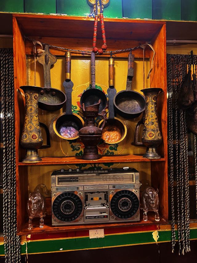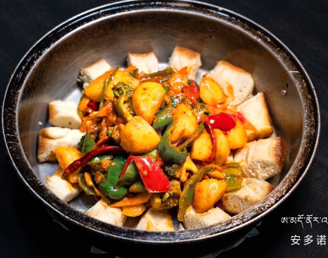 家庭式餐馆,鲜明的藏式风情,走进店里,屋子里都是酥油味,这家店的招牌菜是安多盖饼牦牛肉,饼子由青稞面制成,特别有劲道,里面是土豆、牦牛肉和洋葱,土豆贴在锅底吸收了牛肉和香料的味道,好吃极了。酥油蘑菇,吃起来鲜美无比,蘑菇上面有糌粑。餐厅推荐菜:安多盖饼牦牛肉、芝麻菠菜、甜茶等。