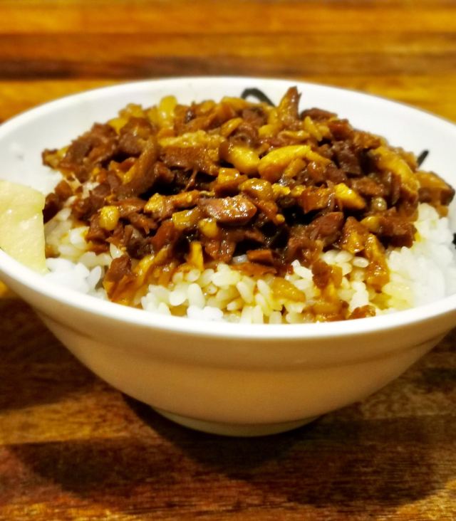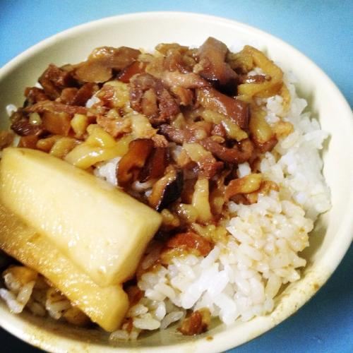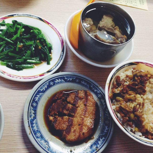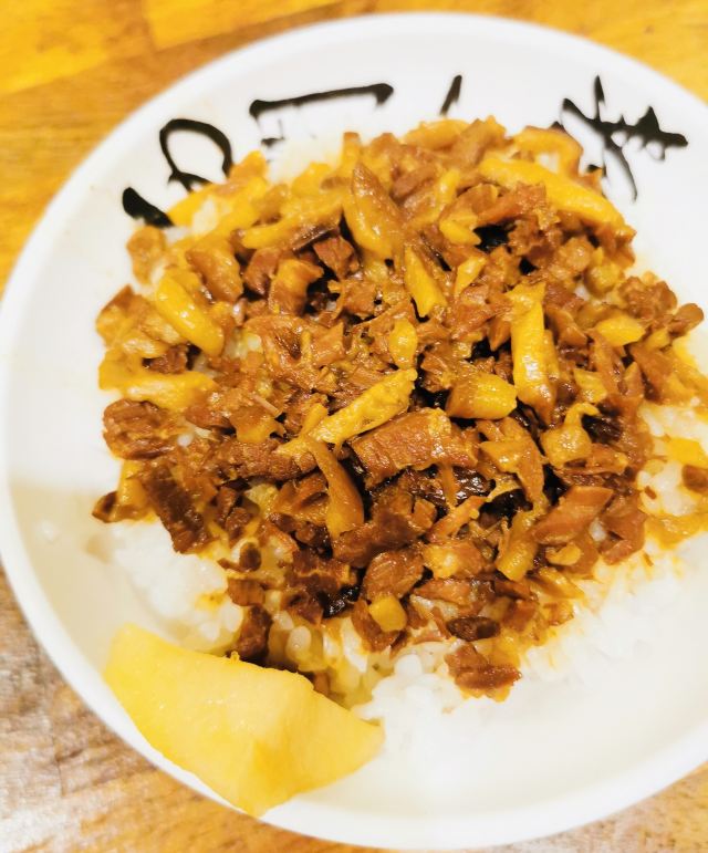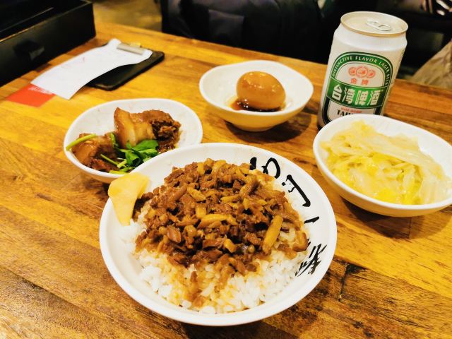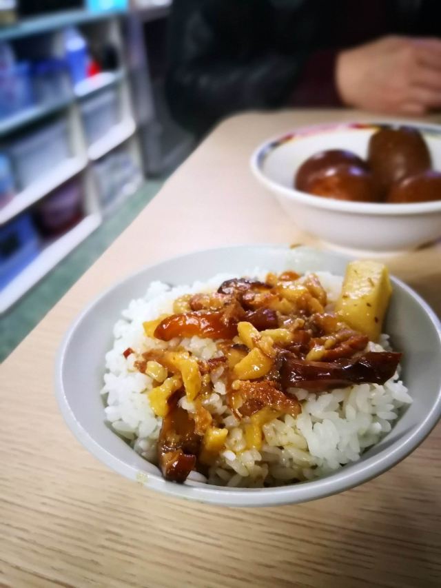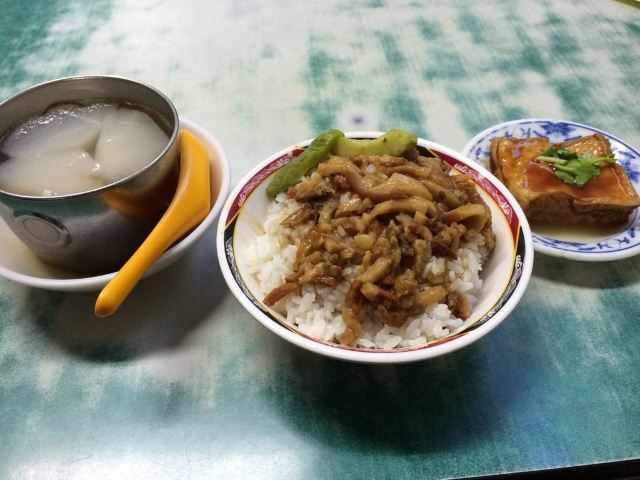 peachsai看看以前的照片,想到去年还能自由旅行,现在只能戴着口罩家里蹲,世事难料。 [薄荷]环境:这家在台北还有点名气,吃的是卤肉饭,比较有地方特色的台湾小吃。正好有空位就进去。服务蛮ok的,一招即来。桌椅间的地方比较狭窄,pose大的坐的会有些难受。价格折算成人民币都还蛮便宜的,滚菜单了,只是胃口有限。 点了卤肉饭,有大小份,小份尝尝味道就好,口感还是不错的,卤肉挺入味。除了卤肉饭,还有鸡肉饭、焢肉饭和鸡卤饭以及白饭,hong肉饭最贵,不过也只要90NTD。 汤品我喜欢,汤汤水水的搭配米饭吃很舒服,而且上桌还挺烫的,我去的季节还比较热,吃得我汗哒哒滴哦。汤品价格也便宜,选了蛤仔鸡汤还有金针排骨汤,都不错和,喜欢小河鲜的可以选前面一种咯,肉也不会特别油腻。汤头蛮清爽的。 小菜也可以选择,卤蛋、菜鲁等等,超级喜欢吃软软糯糯的菜鲁,而且口味很清淡。 饮料点了木瓜牛奶,这个结算方式是单独支付的,口感还比较浓郁。还有一款蜂蜜孤瓜牛奶没有尝试因为看到苦瓜两字可能会接受无能。 [薄荷]环境:卫生间有点意思,用古代那种门闩,还算比较感觉,就是地上会有些返潮。
