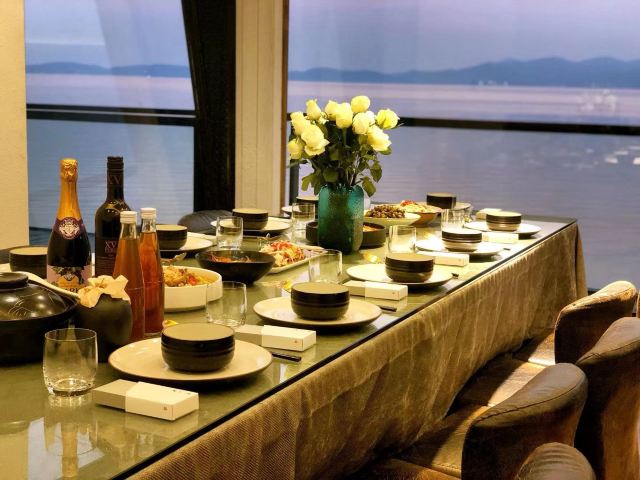 当地颇具名气的粤菜中餐厅,内饰主色调为高贵紫,天花板上悬挂着造型别致的吊灯,搭配黑色圆形餐桌,令人感觉非常的前卫时尚。另外大扇透明落地玻璃窗,使得食客靠窗用餐的同时,还可将城市美景一览无余。