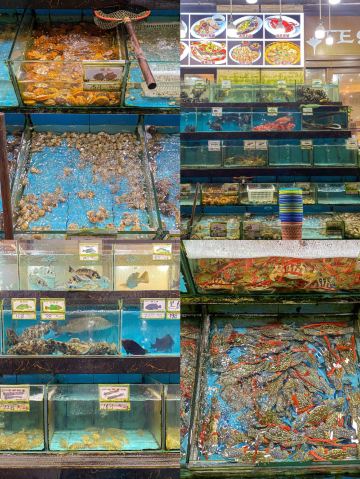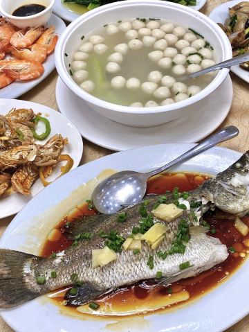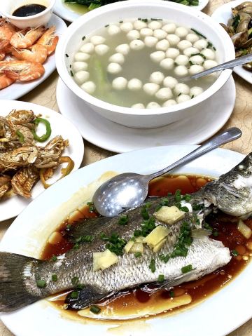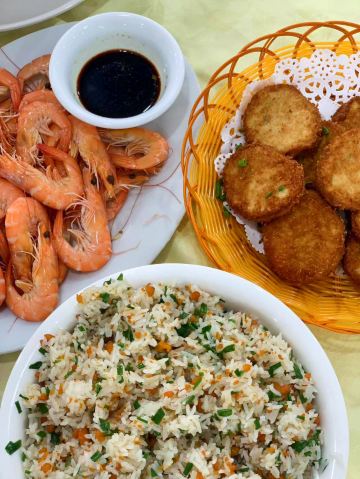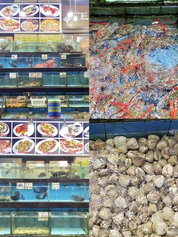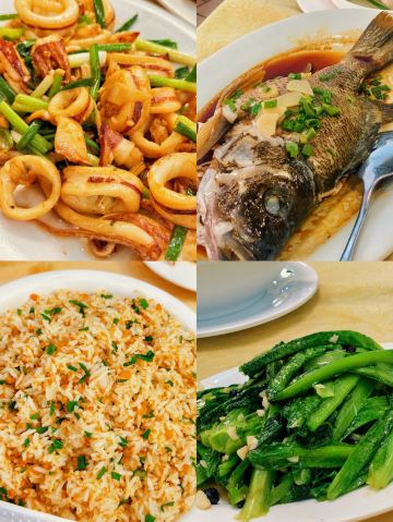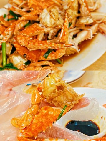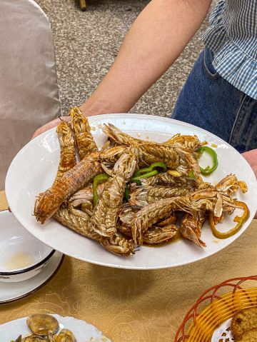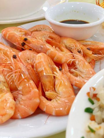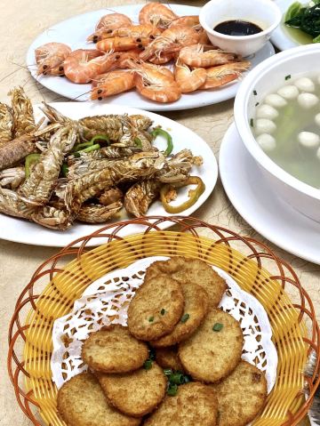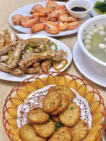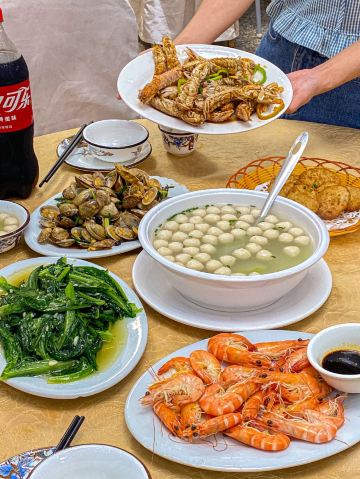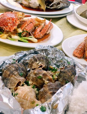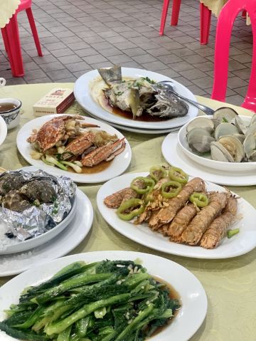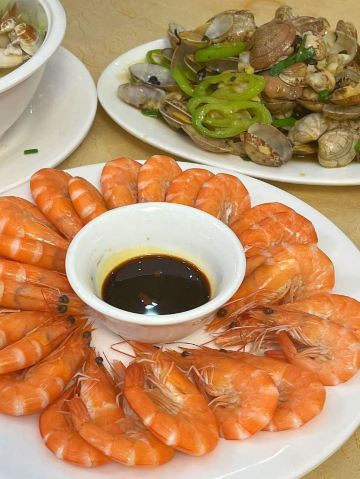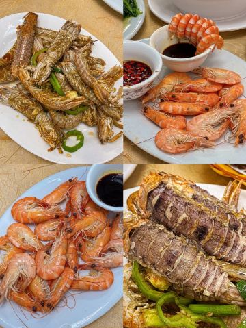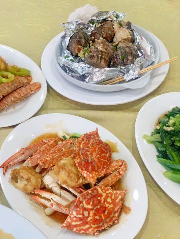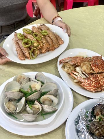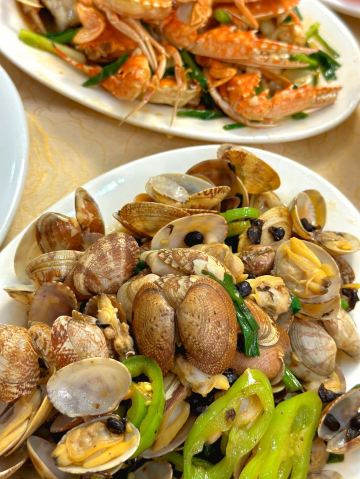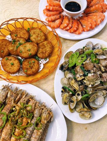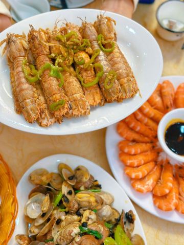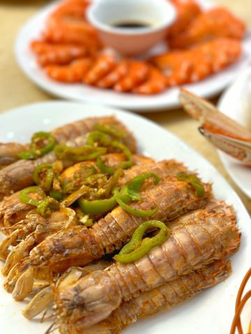 手打墨鱼饼,海胆炒饭,姜葱炒蟹,炒花甲,白灼虾,椒盐濑尿虾,黑蒜烤生蚝,生蚝
