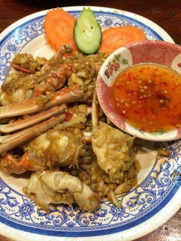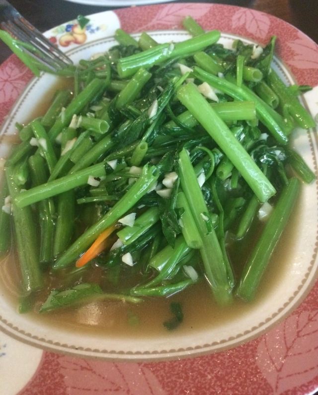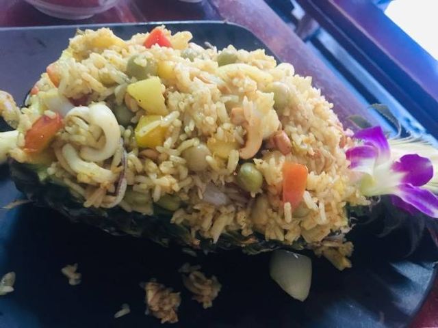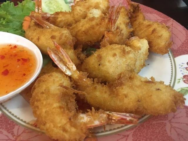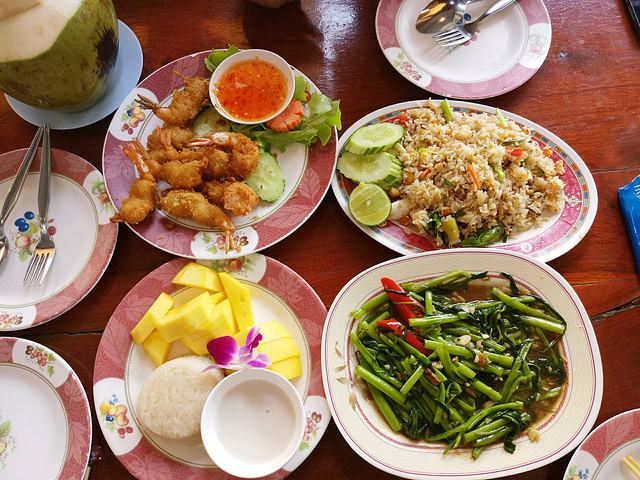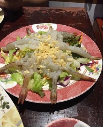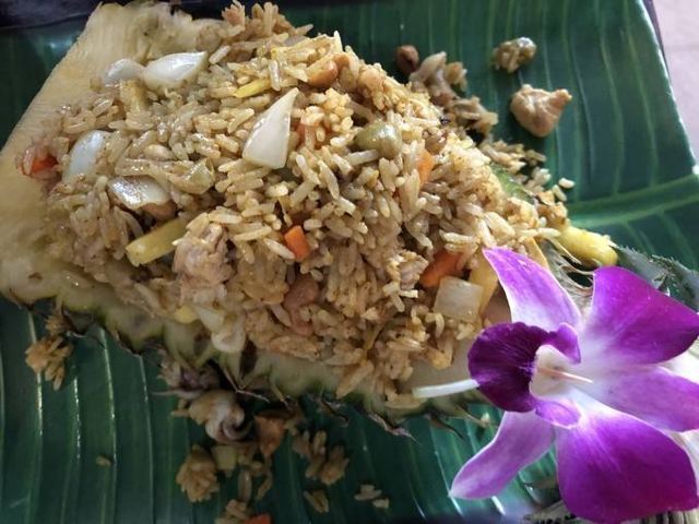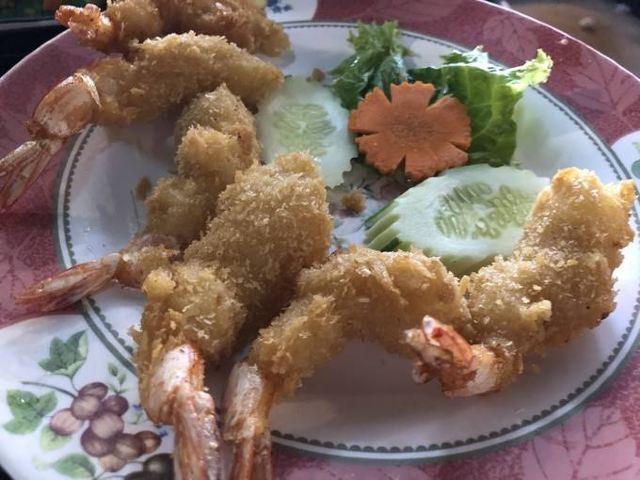 推荐炸虾和空心菜,我发现泰国的空心菜炒的真是不错,像我这种看见绿叶菜直摇头的肉食动物都能自己吃半盘。这家店份量还是给的很足的,两个人点了一份菠萝饭、一份河粉、一份炒空心菜一份炸虾,花了1000泰铢,性价比蛮高的。。