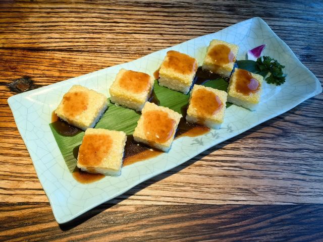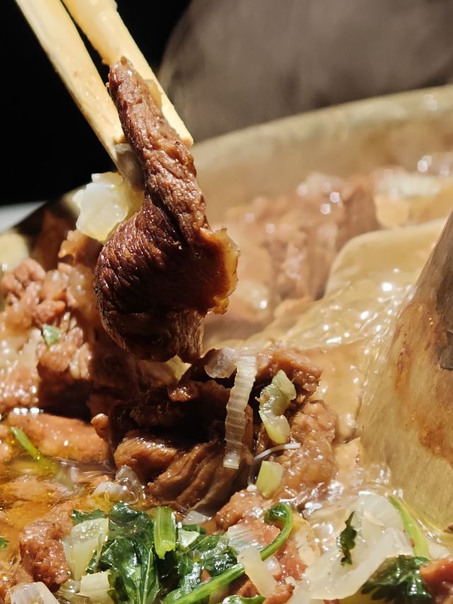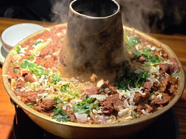 :刀工精湛的炸制茄子,外酥里嫩配秘制酸甜酱。 黄米凉糕:黄米与糯米分层制作,搭配桂花酱解腻爽口。 牛肉铜火锅:
