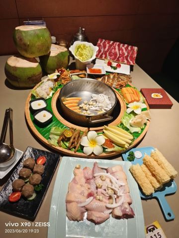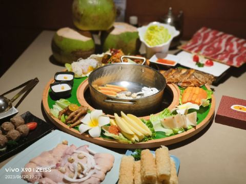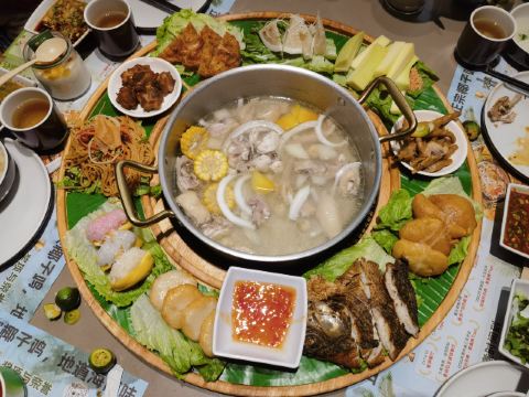 吃遍海南大转盘,原味+泰式冬阴功锅,原味椰子鸡锅,山林散养文昌鸡,泰式冬阴功锅,去骨文昌鸡(仅去大骨),黑松露虾滑,百花酿油条,竹笙,瀑布土豆丝,手作响铃卷,金砖豆腐粒,海南椰子饭,菠萝蜜椰香糯米团,椰奶清补凉,海南酥嫩冲浪鱼,琼海盐焗乳鸽,椰汁西米流心球,热带风情沙爹鸡肉串,椰丝木薯饼,酥脆澄迈桥头地瓜,海鸭蛋卷,炸虾饼,菠萝蜜盐焗鸡,藤桥蒜香骨,定安黑猪肉粽,雪花牛小排,雪蟹柳,黑猪松板肉,乌鸡卷,雪花牛上脑,八秒上岸肥牛,鲜螺片,凤尾虾,獐子岛鲜鲍鱼,蜀海竹笙虾滑,南美白虾,海底墨鱼仔,手打墨鱼滑,潮州手打牛肉丸,芝士肠,鸭血,黑豆腐,鲜腐竹,绣球菌,山珍竹笙, 金针菇,鲜椰肉,珍珠马蹄,鲜蔬六拼,文昌鸡,椰子鸡,原味椰子鸡,海南粉,椰子饭