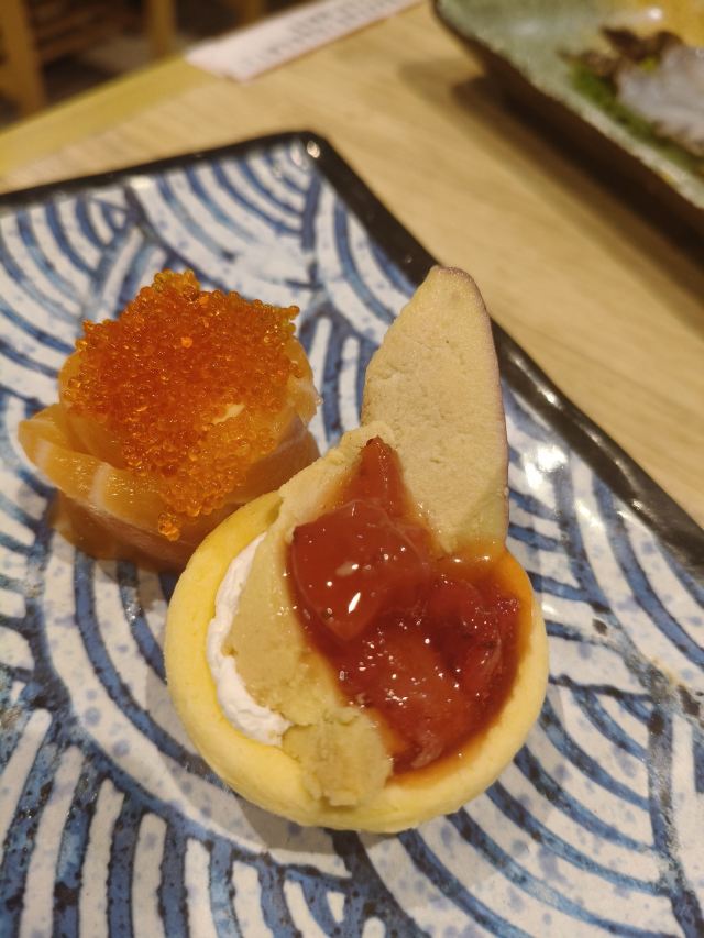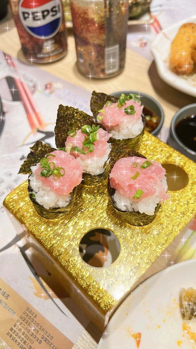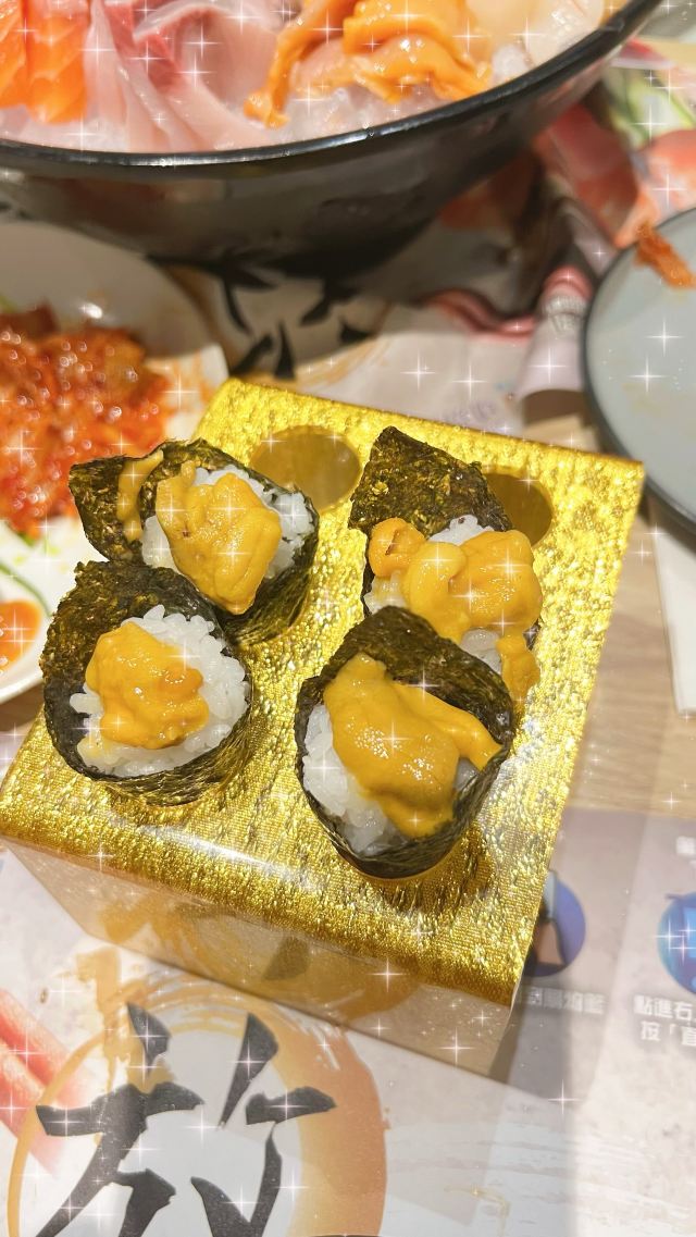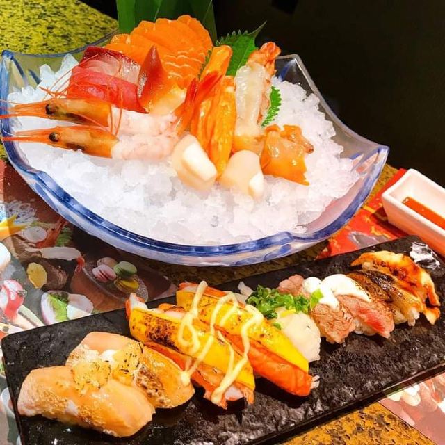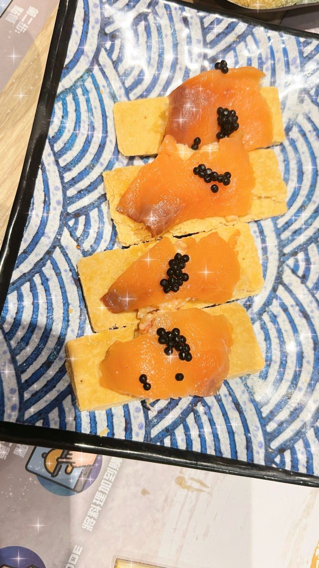 三文鱼刺身,甜虾刺身,盐烤虾,牛舌,哈根达斯比利时朱古力味,虎虾刺身,火炙寿司,羊架,炸榴莲球,菠萝片,烧纽西兰羊鞍,蒲烧鳗鱼,盐烧牛舌,芝麻鸡翼,海胆手卷,鲭鱼,牛仔肉